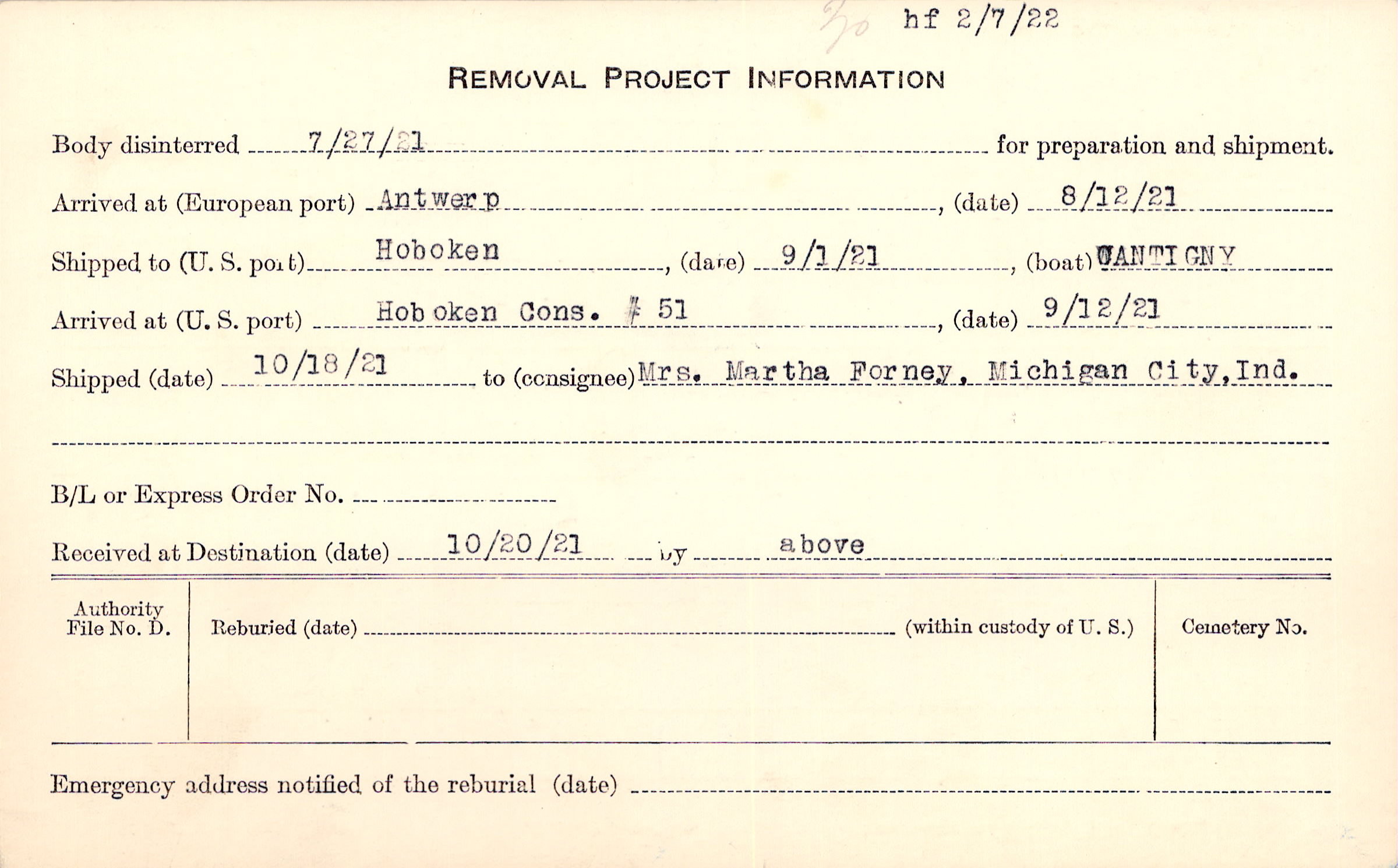 Body disinterred 7/27/1921 for preparation and shipment.
