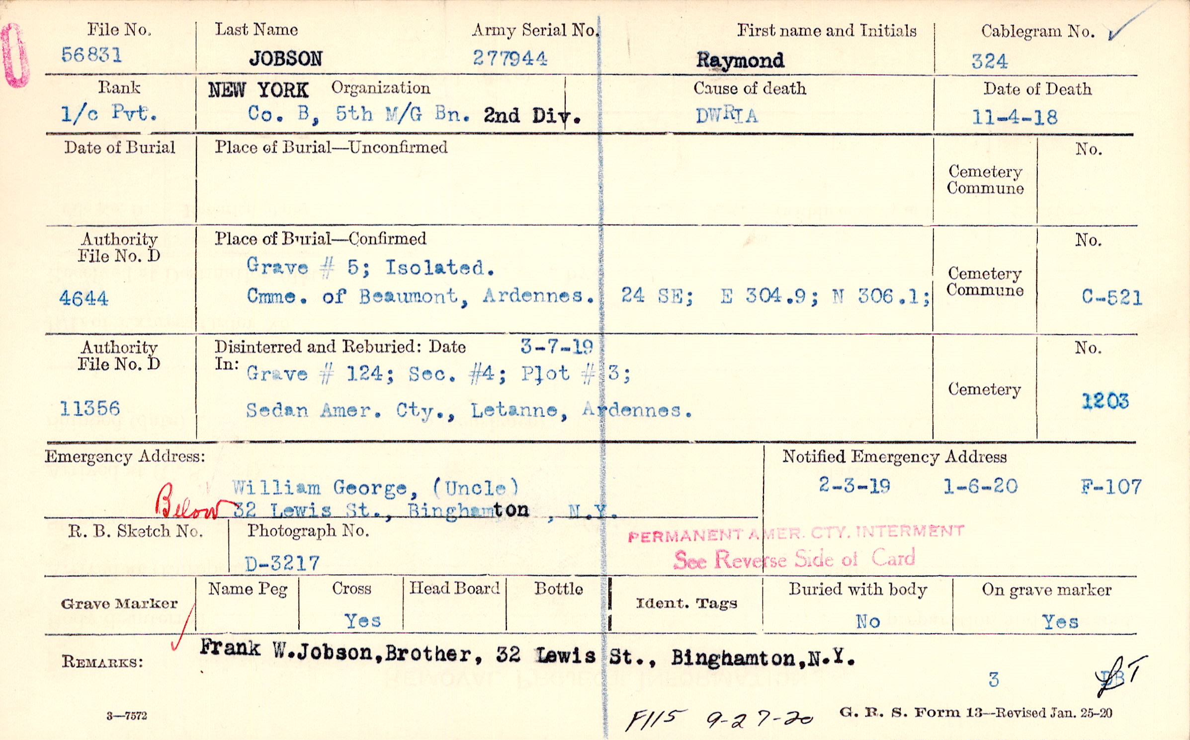 Frank W. Jobson, Brother, 32 Lewis St., Binghamton, N.Y., F115 9-27-20