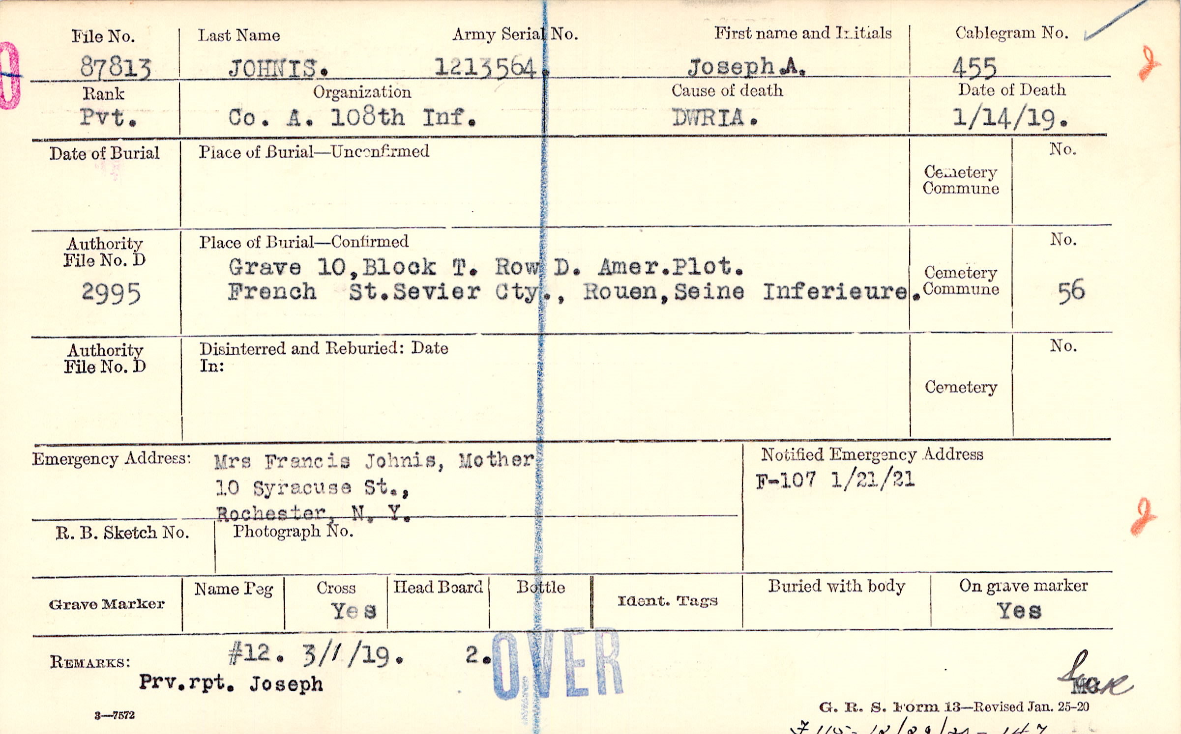 Grave 10, Block T, Row D, Amer. Plot, French St. Sevier Cty., Rouen, Seine Inferieure.