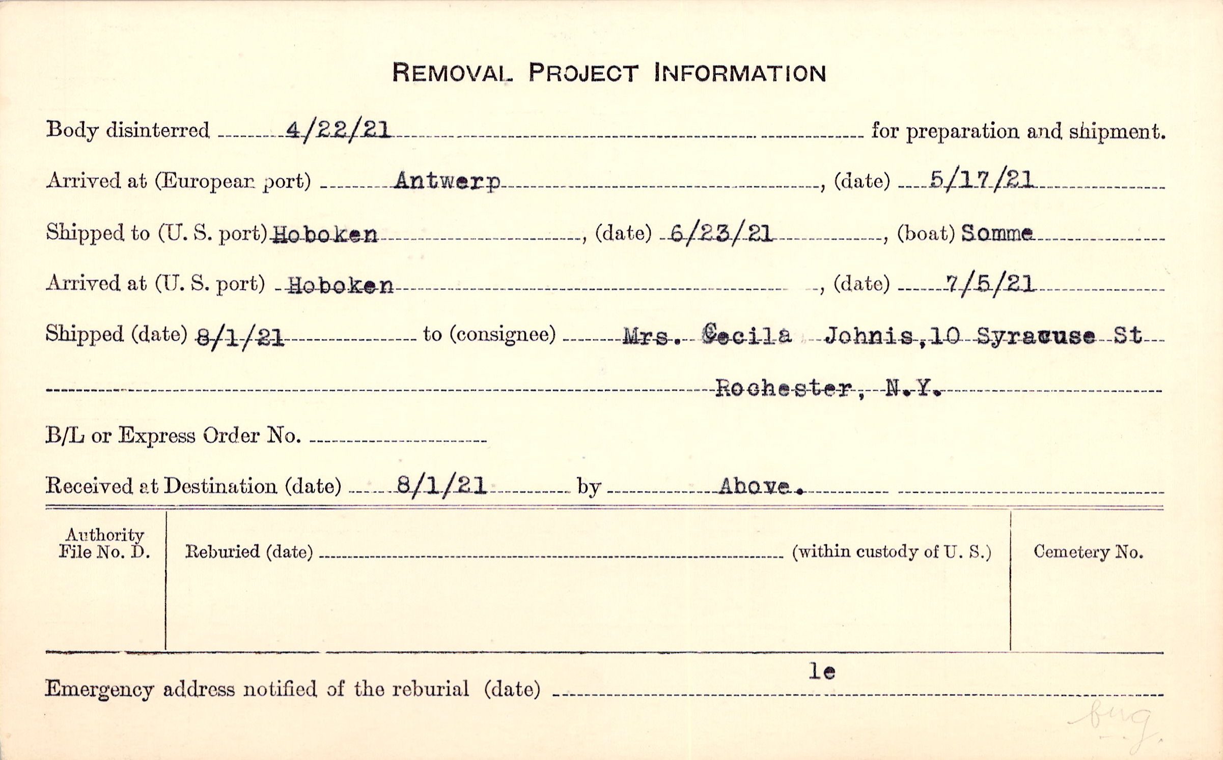 to Mrs. Cecila Johnis, 10 Syracuse St, Rochester, N. Y.