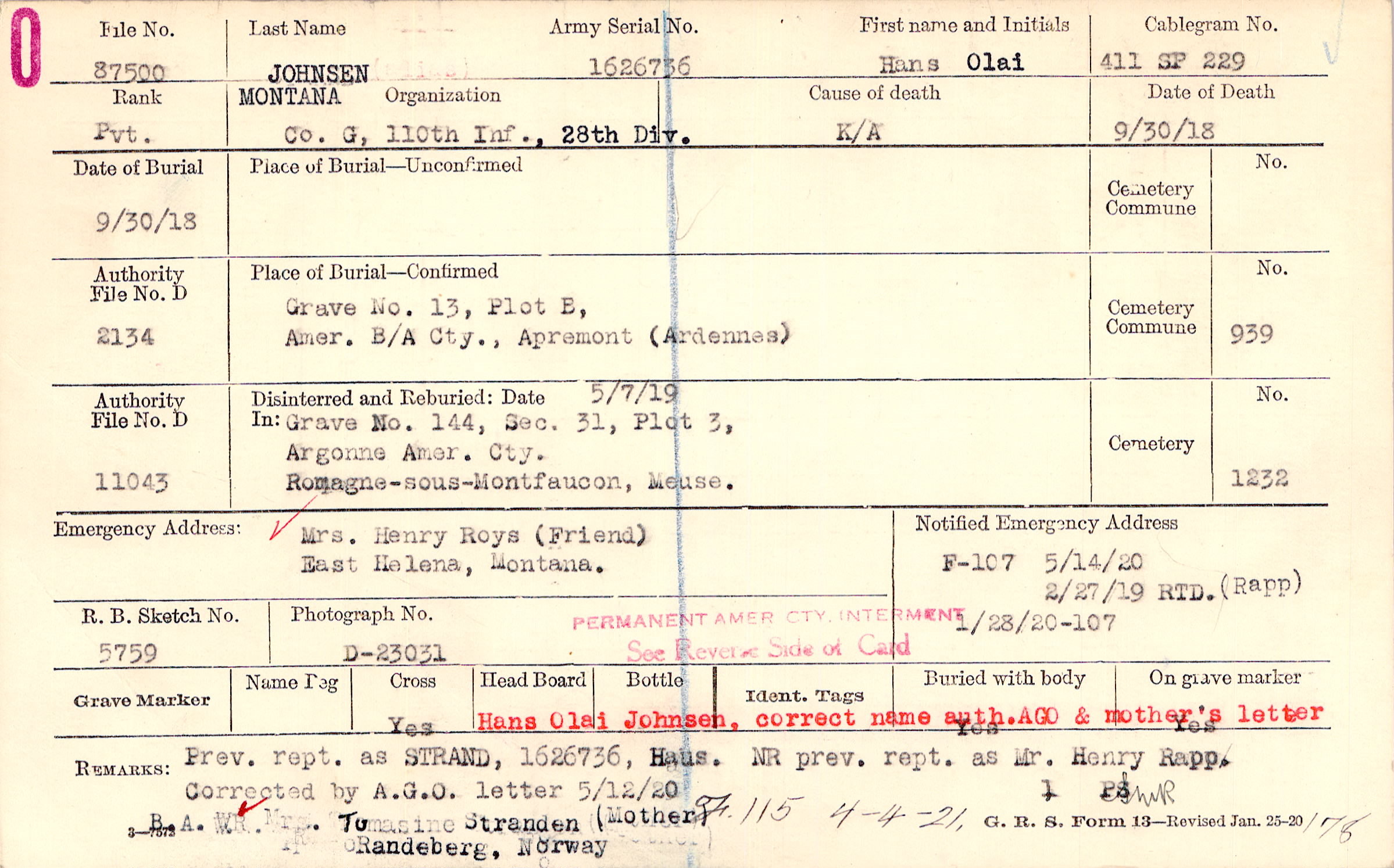 Form 107: 5/14/1920, 2/27/1919 RTD (Rapp), Form 107: 1/28/1920