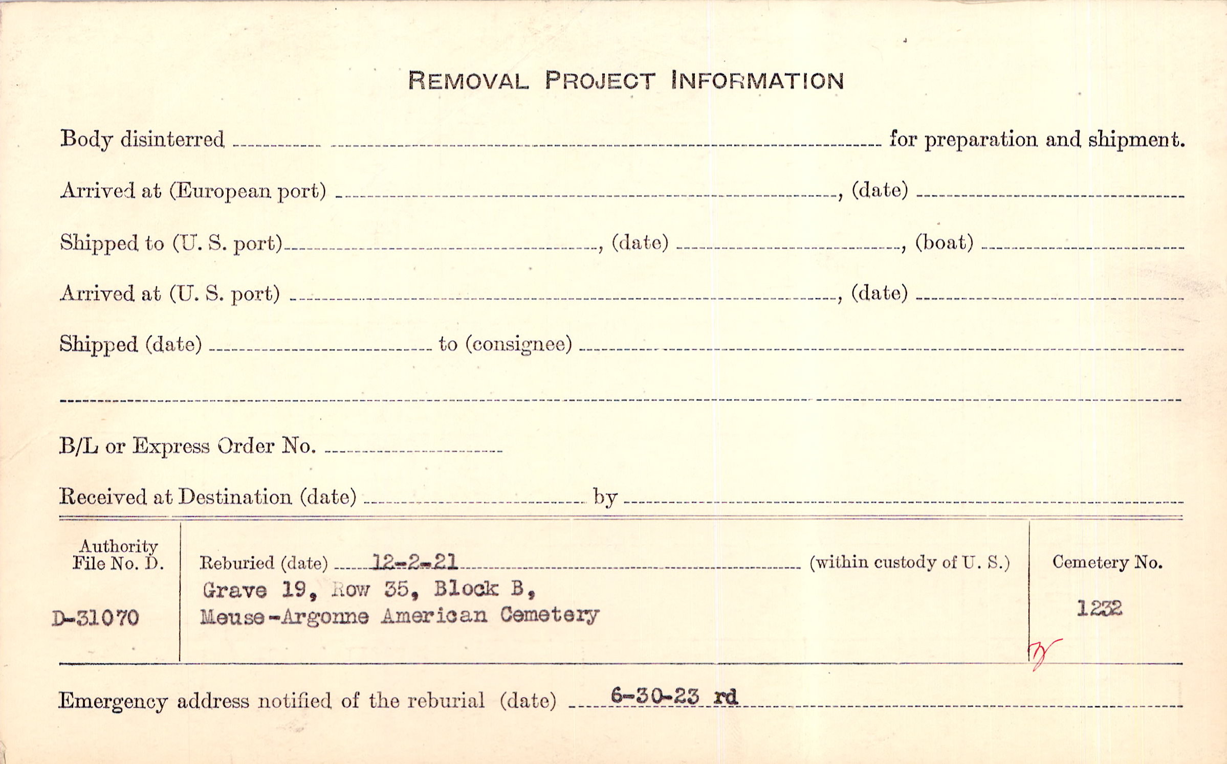 | Permanent Burial in Foreign Cemetery |