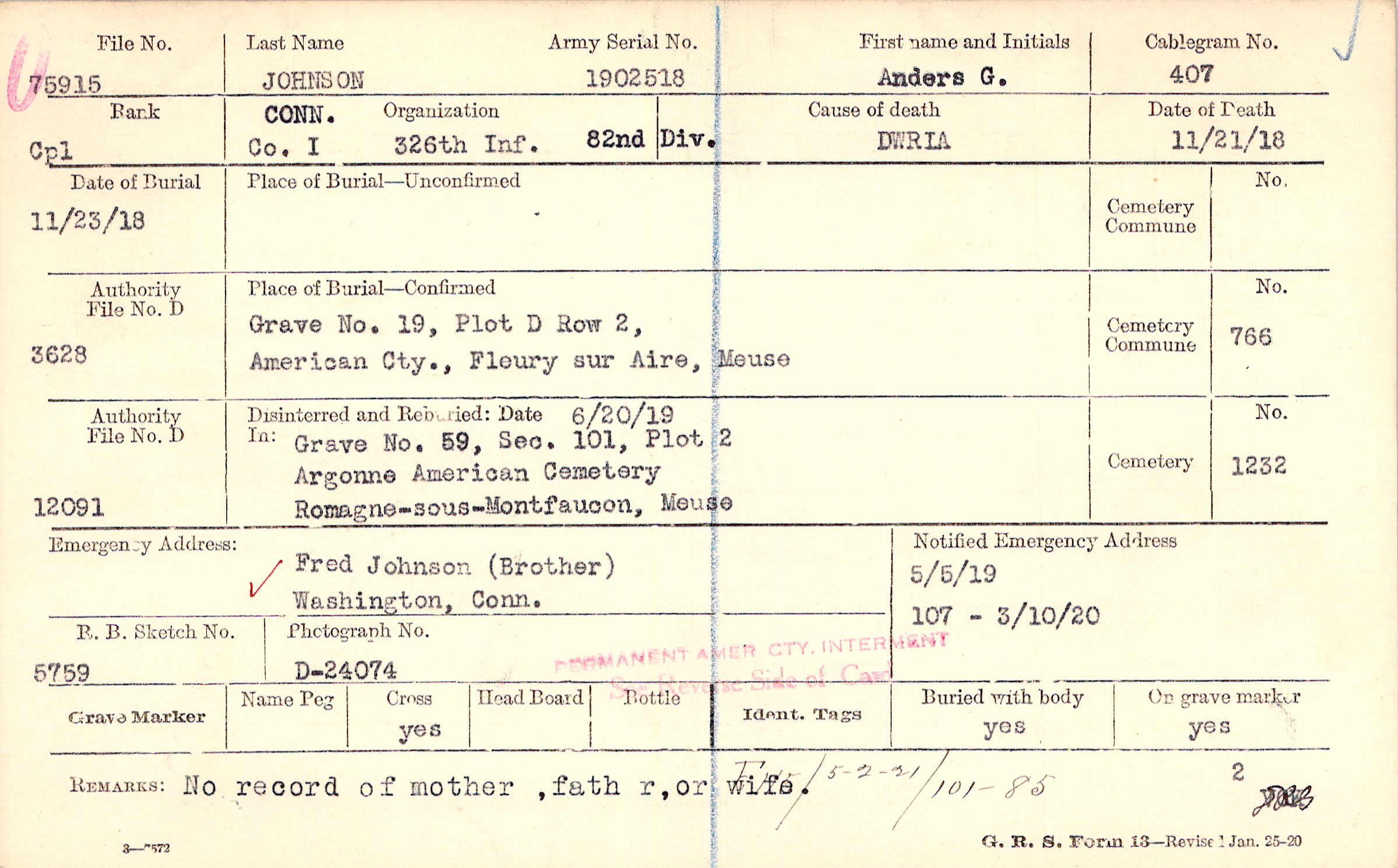 Grave 19, Plot D, Row 2, American Cty., Fleury sur Aire, Meuse