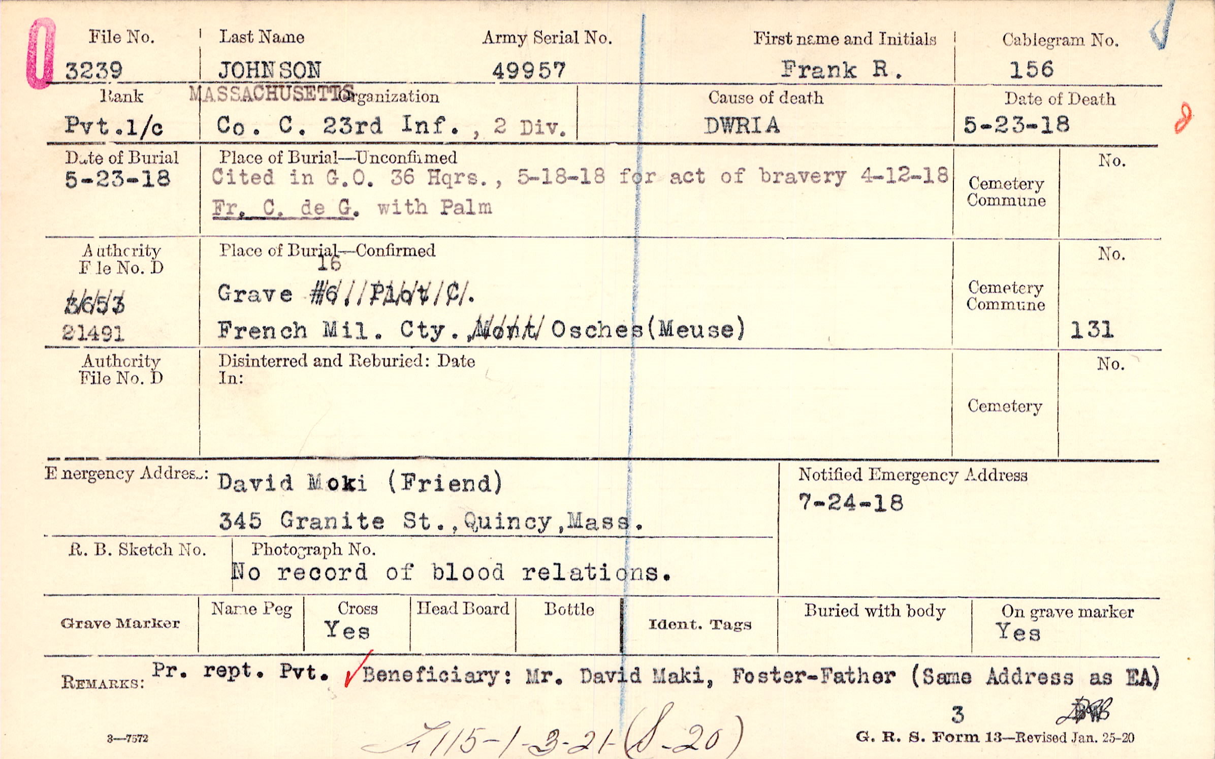 David Moki (Friend), 345 Granite St., Quincy, Mass., No record of blood relations.