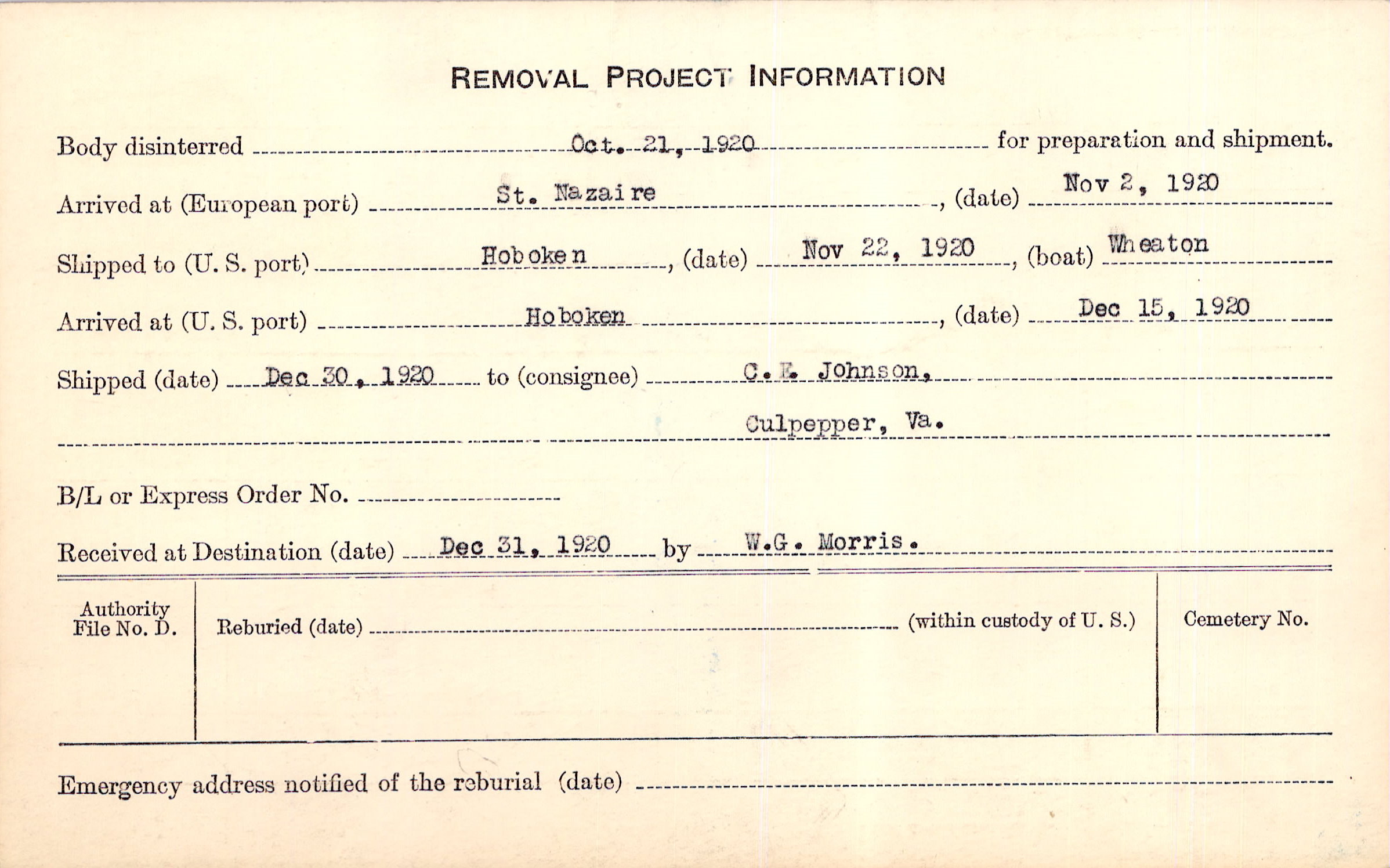 Body disinterred 10/21/1920 for preparation and shipment.