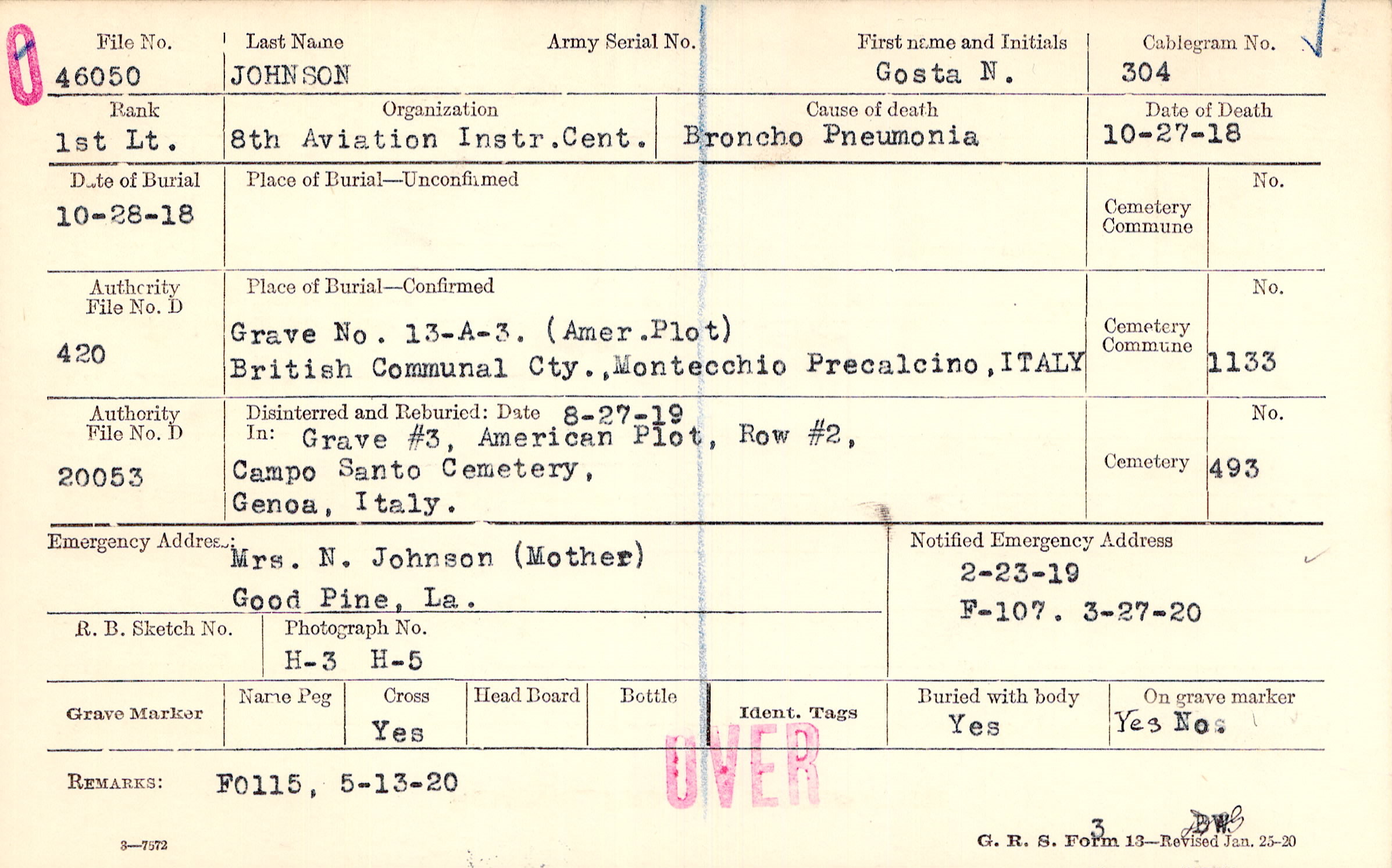 Grave 13-A-3, Amer. Plot, British Communal Cty., Montecchio, Precalcino, ITALY