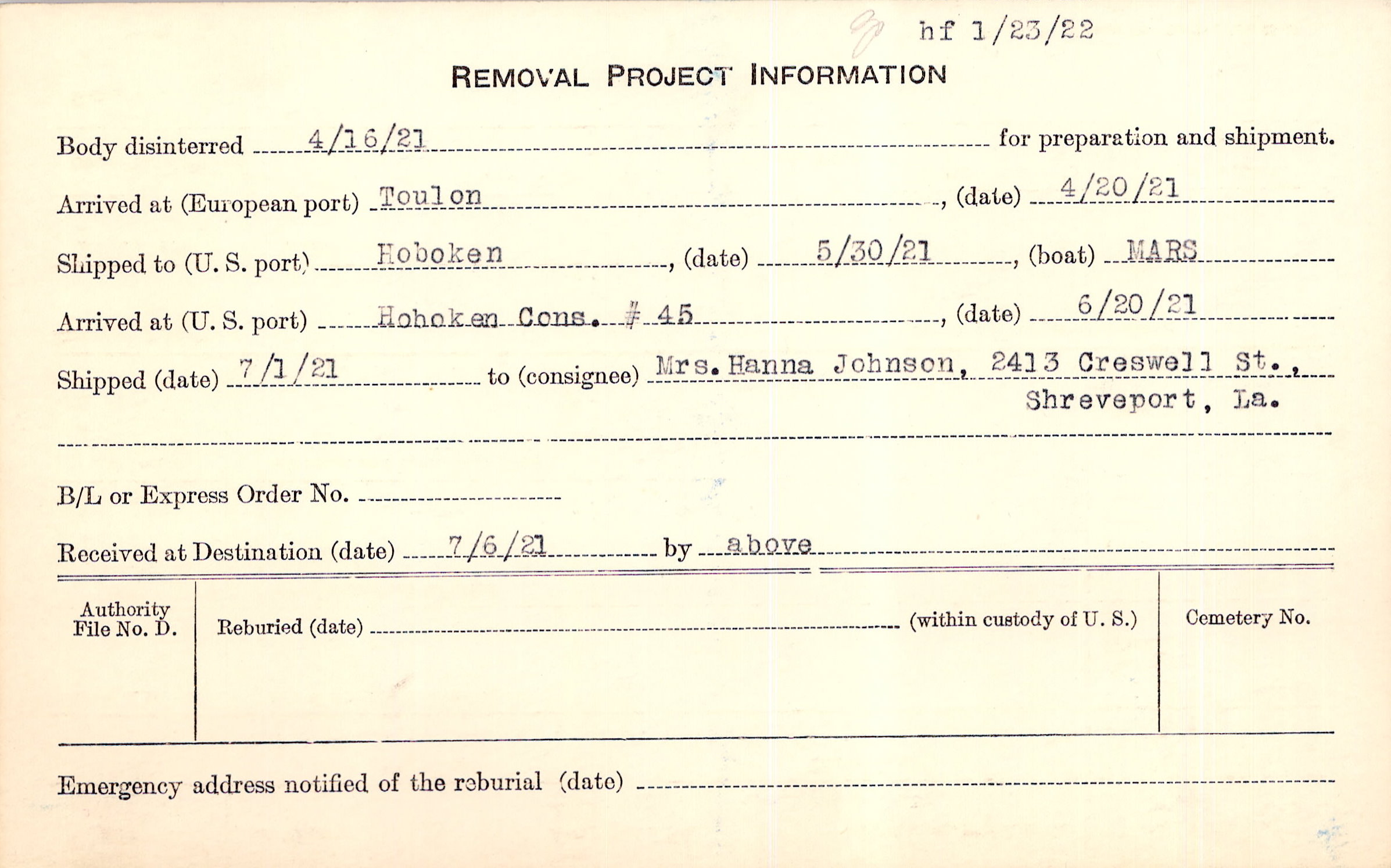 to Mrs. Hanna Johnson, 2413 Creswell St., Shreveport, La.