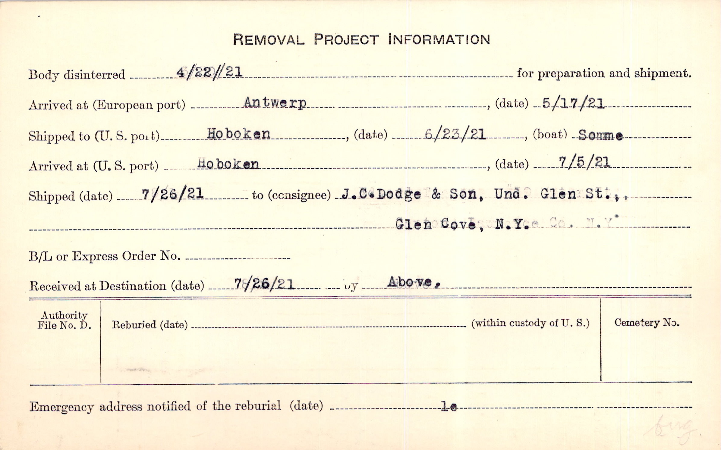 Body disinterred 4/22/1921 for preparation and shipment.