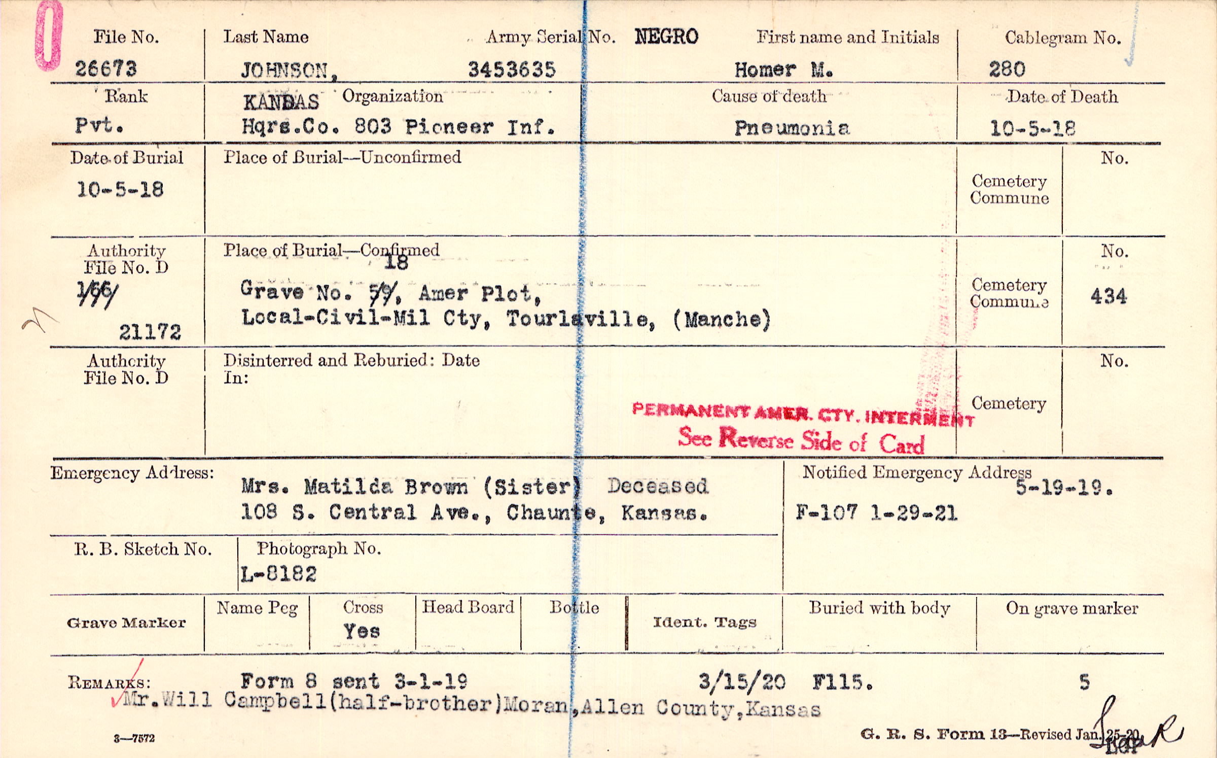 Mr. Will Campbell (half-brother), Moran, Allen County, Kansas, Form 8 sent 3-1-19, 3/15/20 F115.