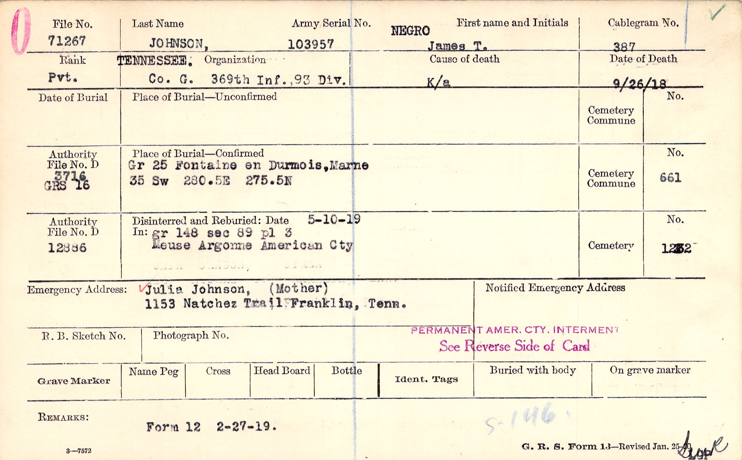 Julia Johnson, (Mother), 1153 Natchez Trail Franklin, Tenn.