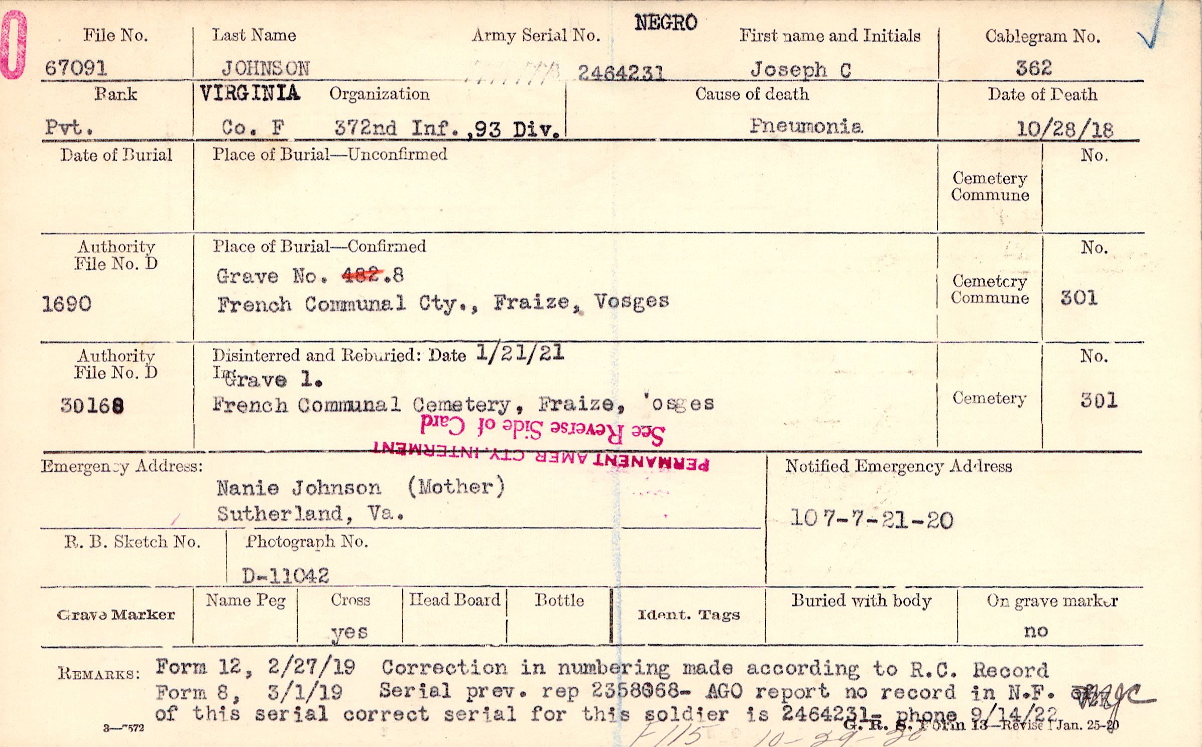 Form 8, 3/1/19 Seraial prev.rep 2358068- AGO report no record in N.F. of this serial correct serial for this soldier is 2464231 - phone 9/14/22, Form 12, 2/27/19, Correction in numbering made according to R. C. Record, F115 10-29-20
