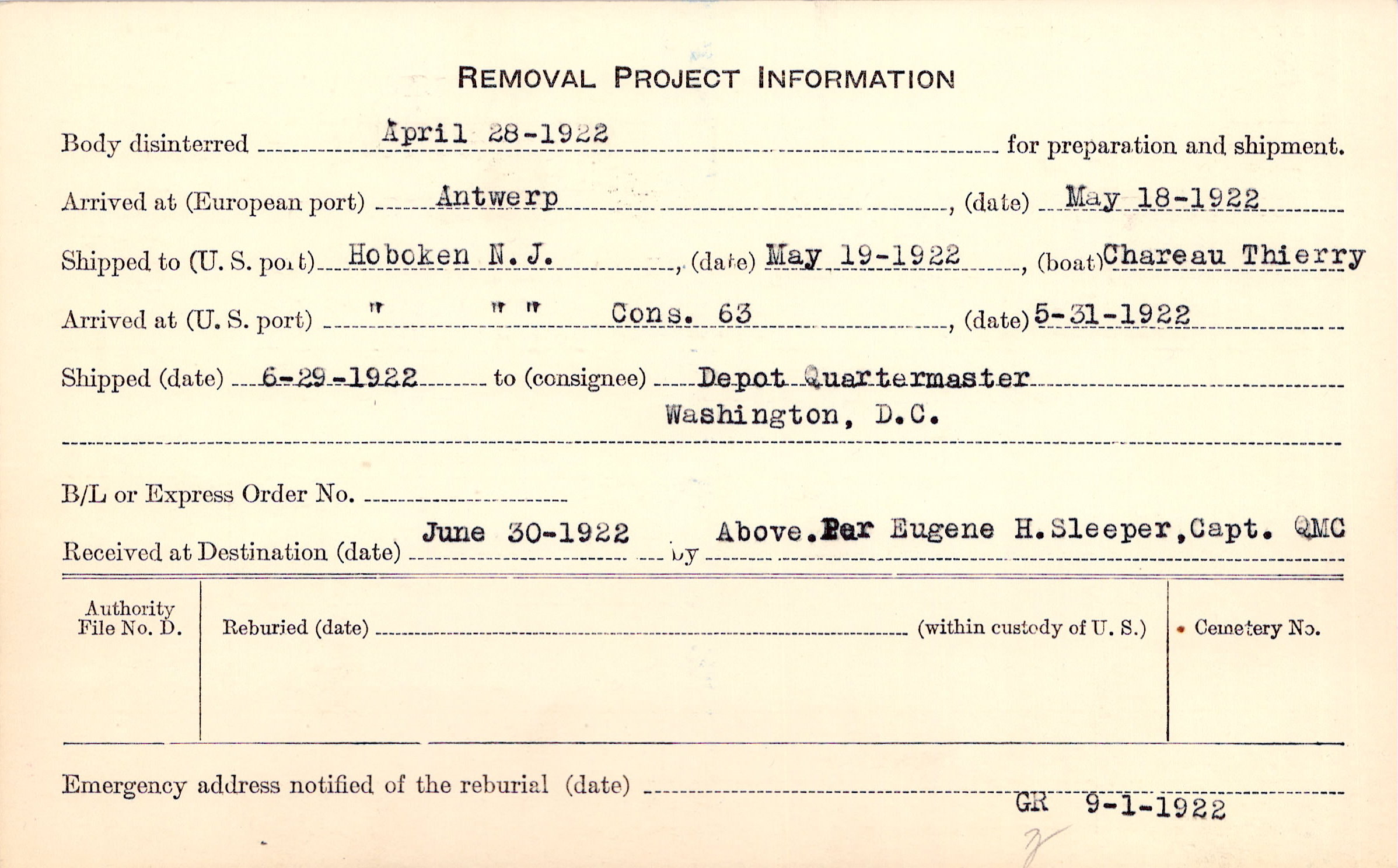 by Above. Per Eugene H. Sleeper, Capt. QMC