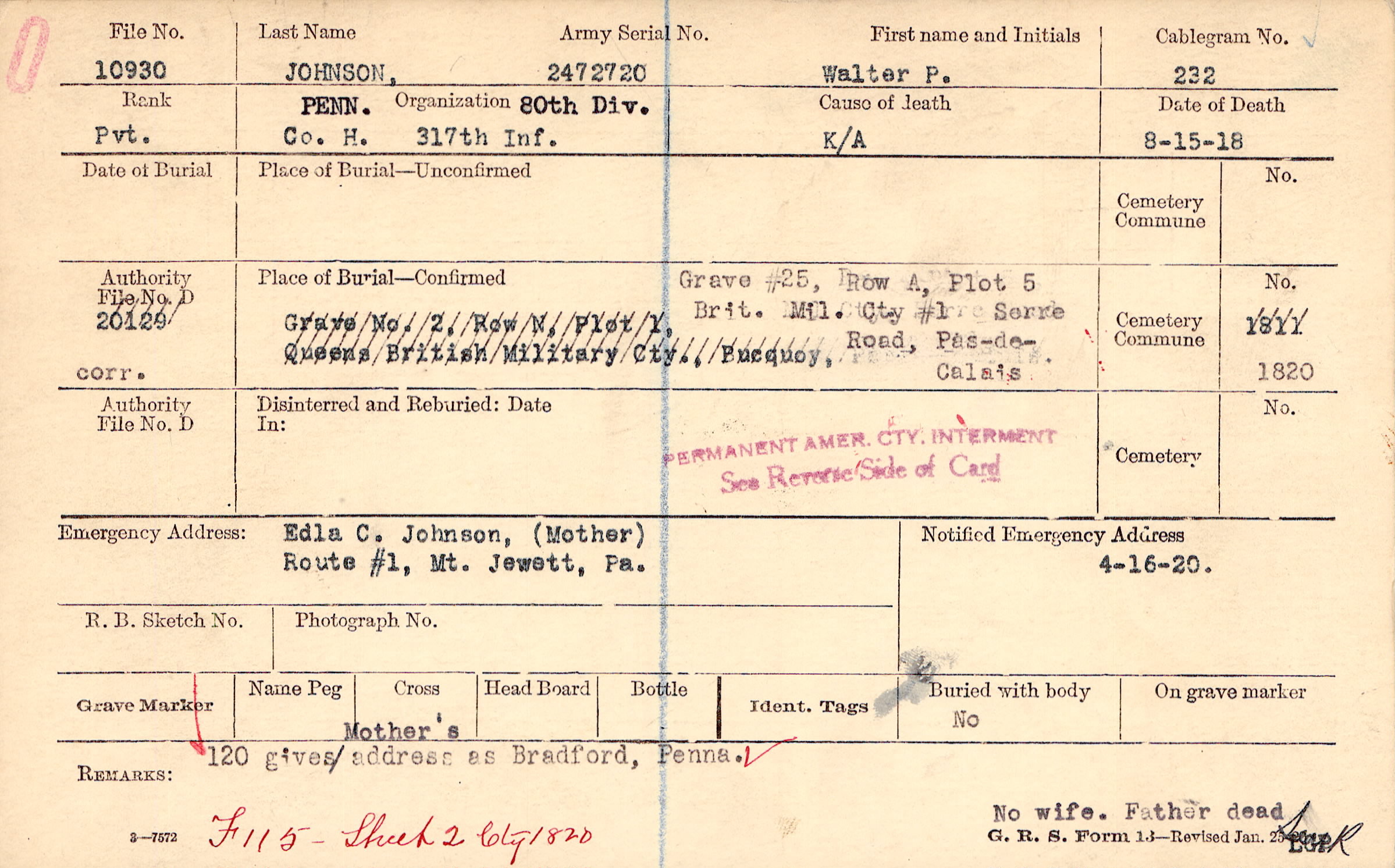 Edla C. Johnson, (Mother), Route #1, Mt. Jewett, Pa.