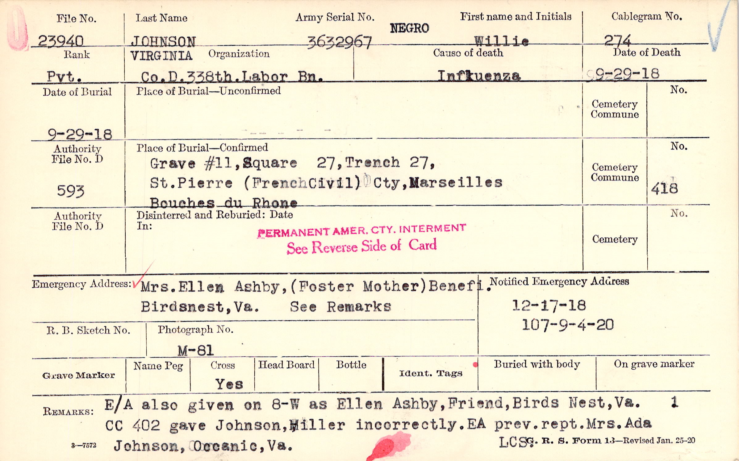 Grave #11, Square 27, Trench 27, St. Pierre, (French Civil) Cty, Marseilles, Bouches du Rhone