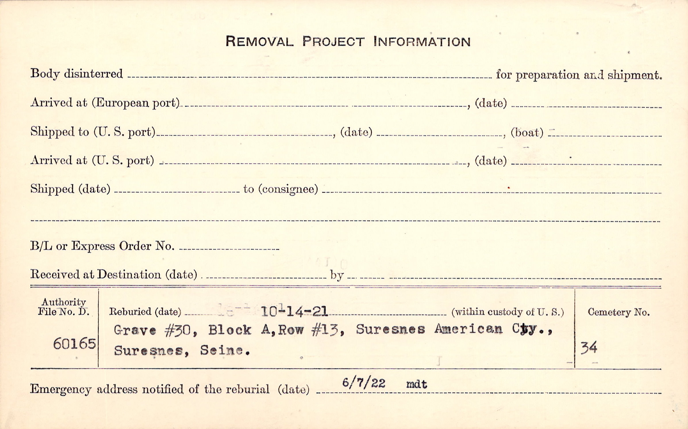 | Permanent Burial in Foreign Cemetery |