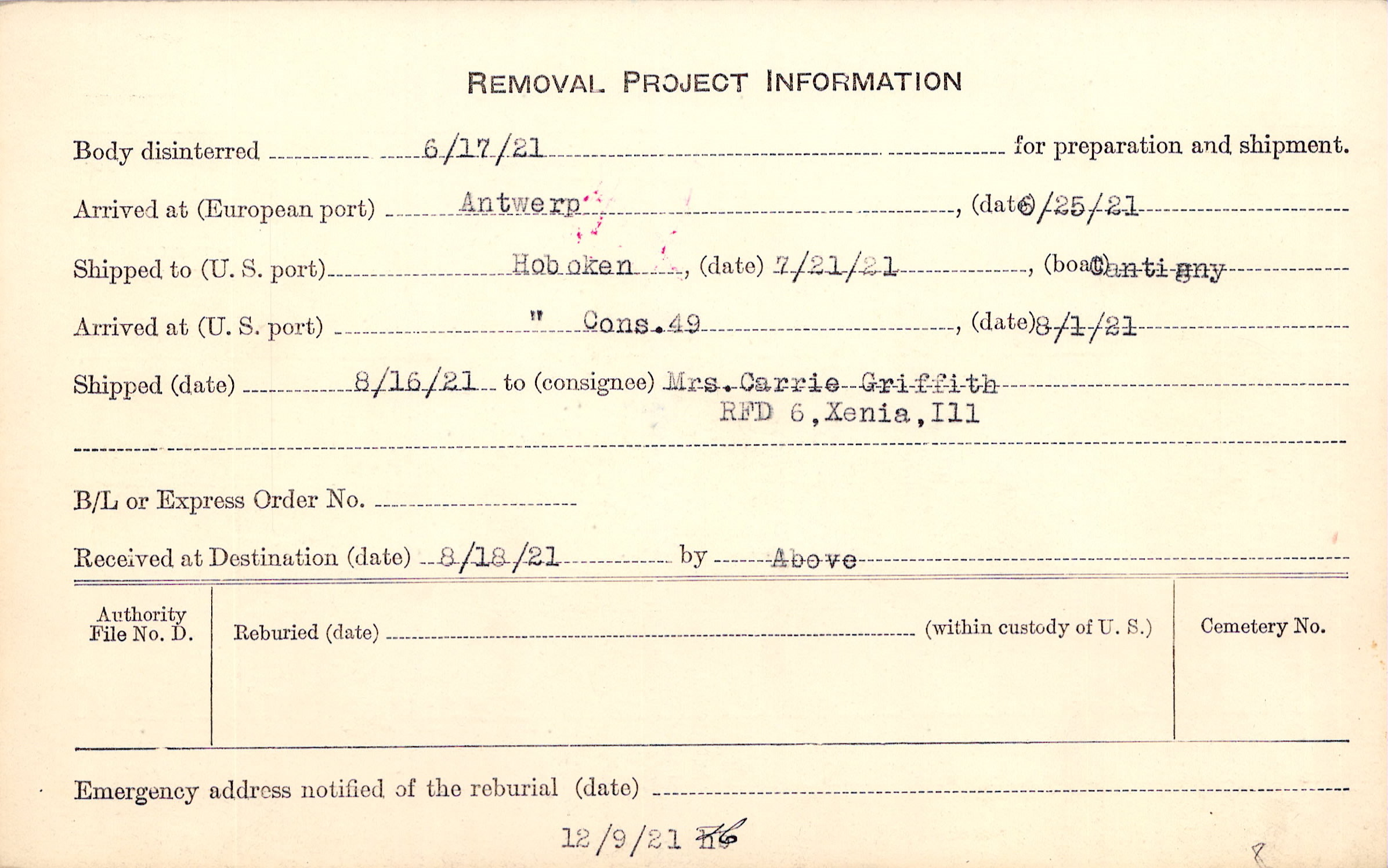 Body disinterred 6/17/1921 for preparation and shipment.