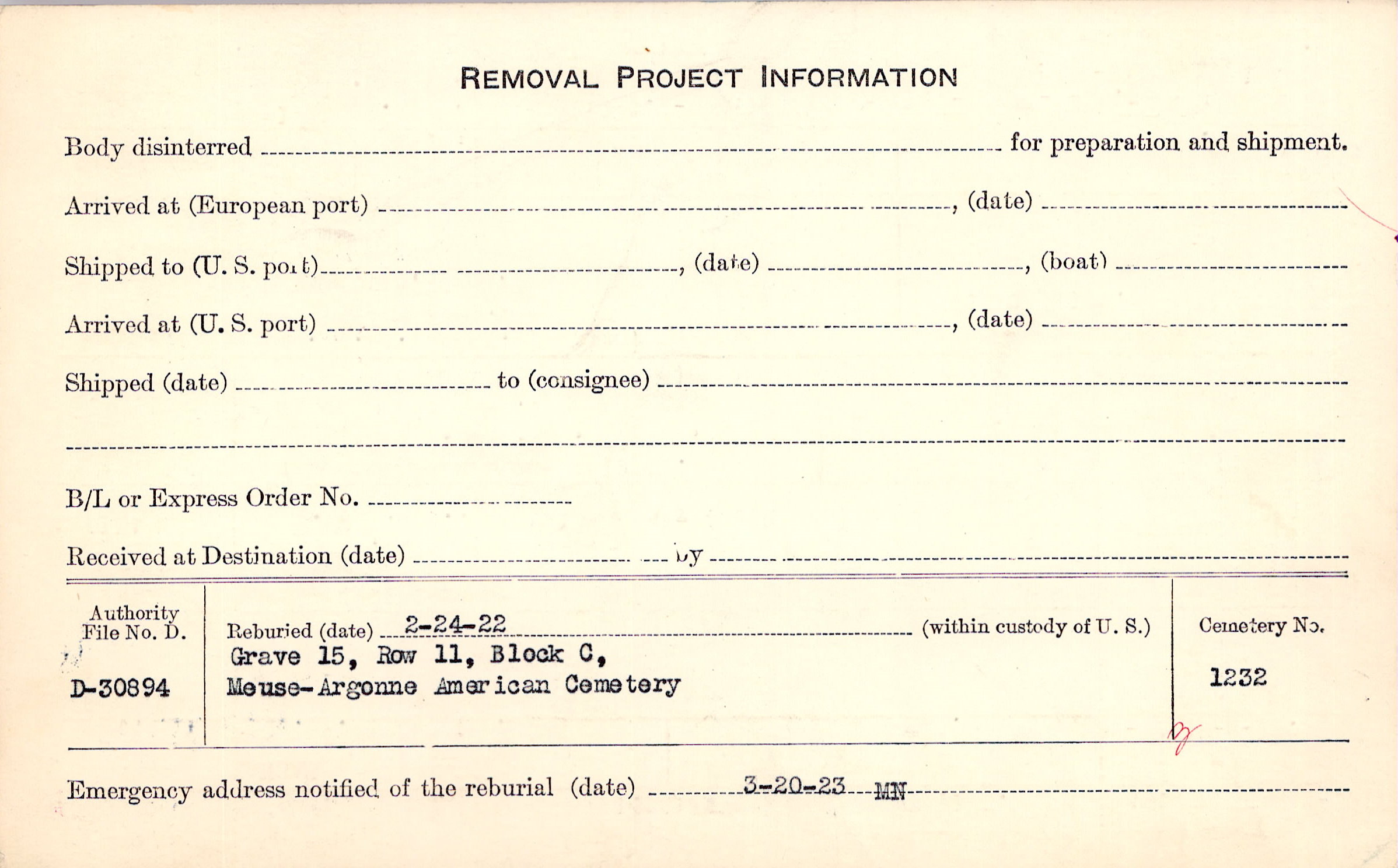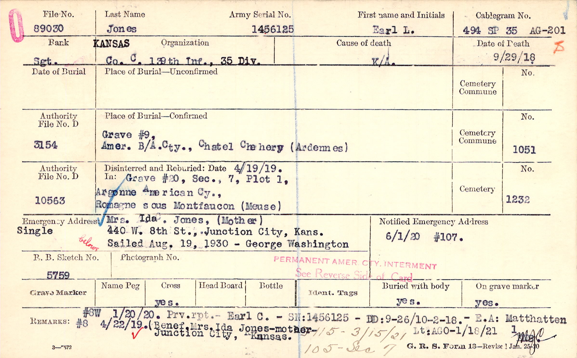 Grave 20, Section 7, Plot 1, Argonne American Cemetery, Romagne-sous-Montfaucon, Meuse