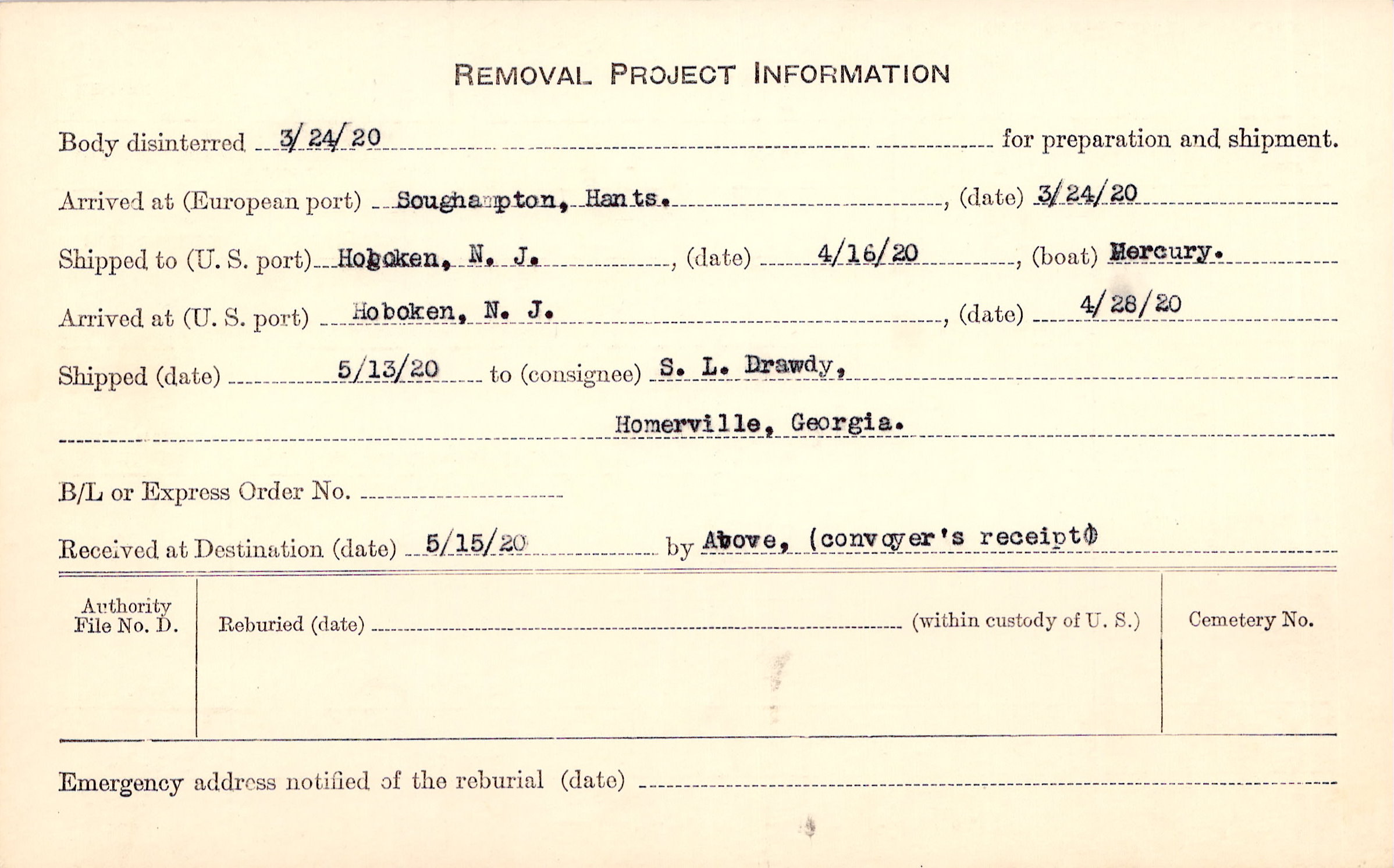 Body disinterred 3/24/1920 for preparation and shipment.
