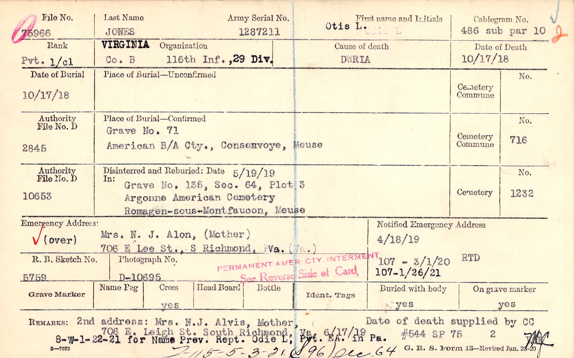 Mrs. N. J. Alon, (Mother), 706 E Lee St., S Richmond, Va., (over)