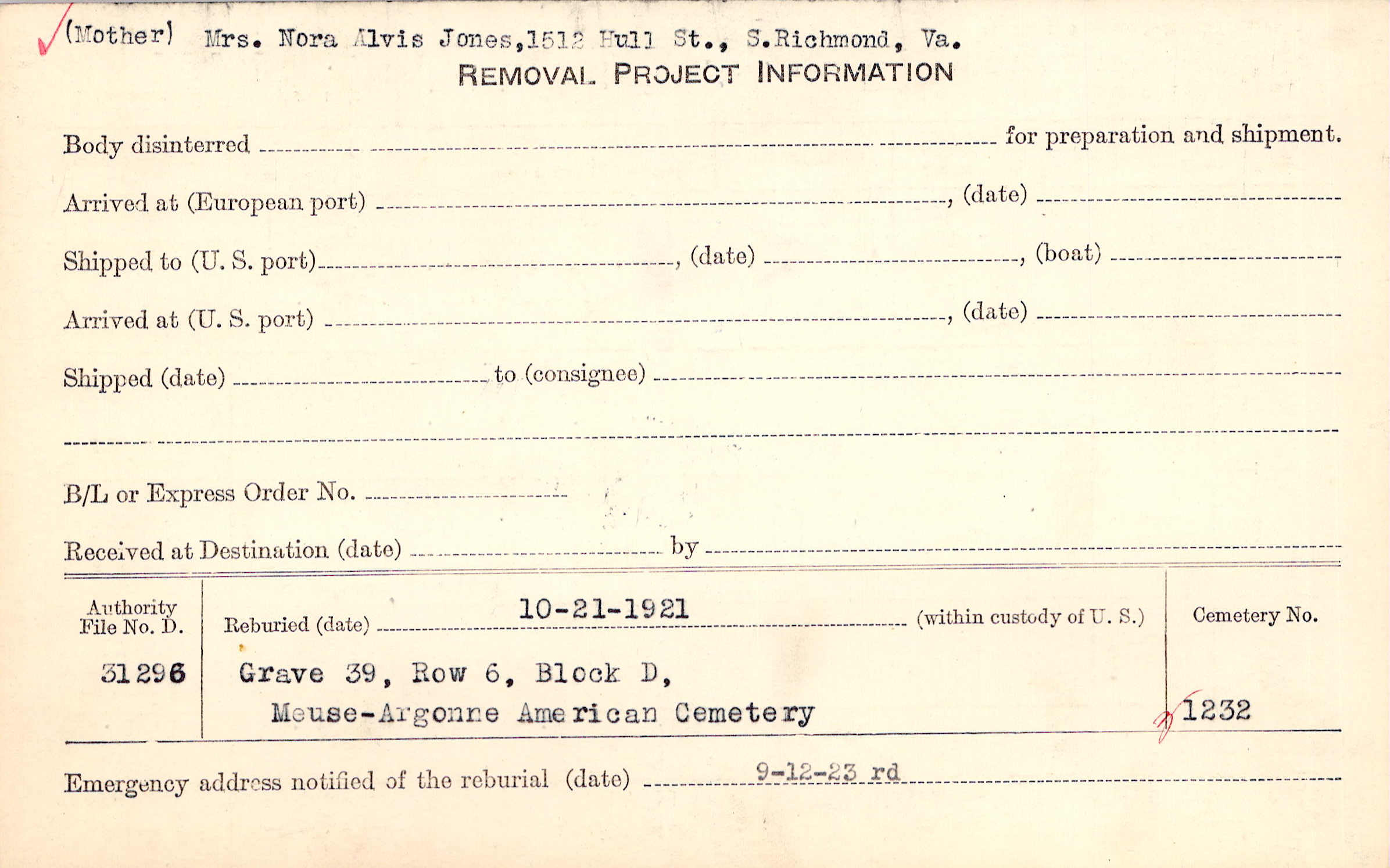 (Mother) Mrs. Nora Alvis Jones, 1512 Hull St., S. Richmond, Va. |