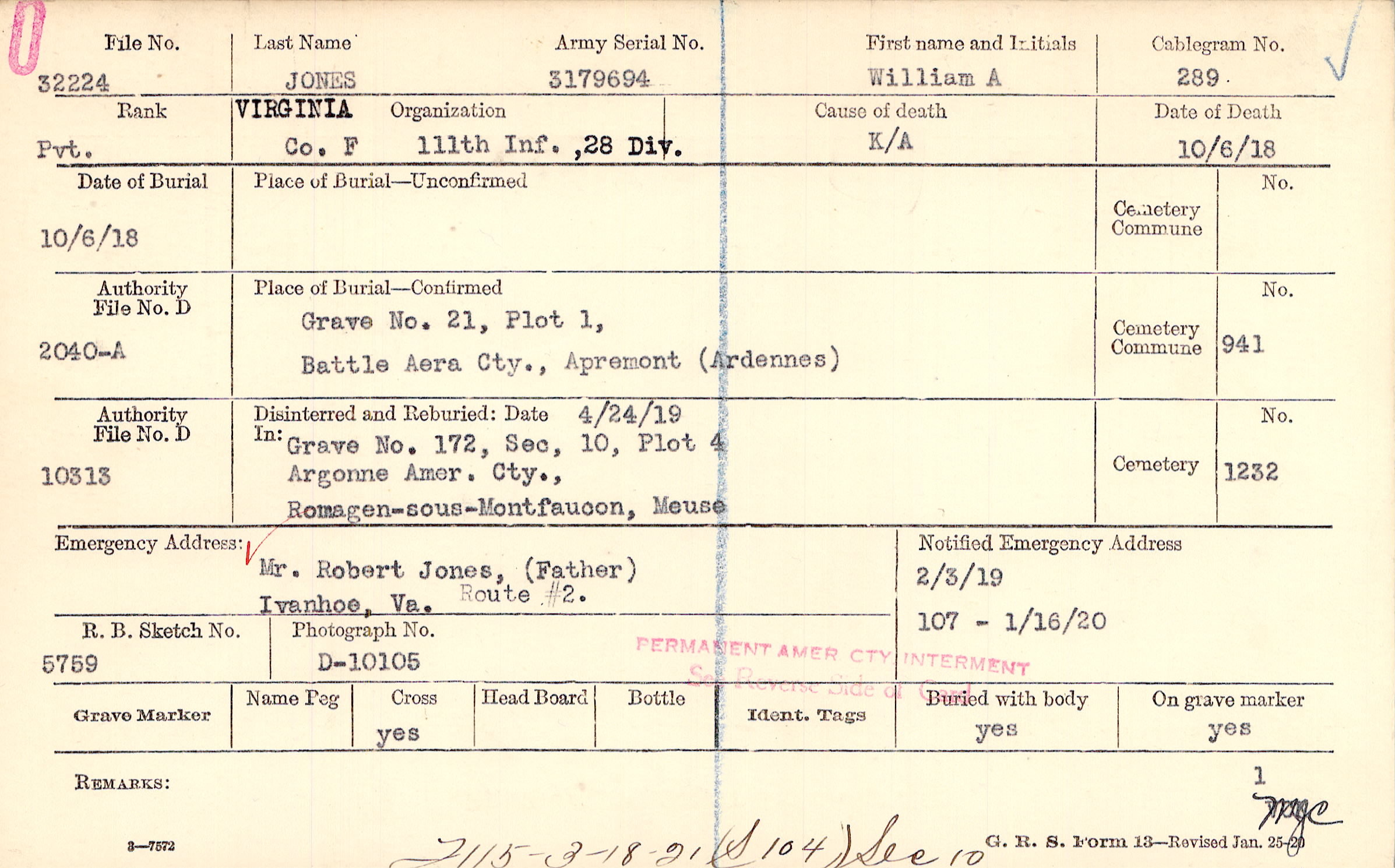 Mr. Robert Jones, (Father), Ivanhoe, Va. Route #2.