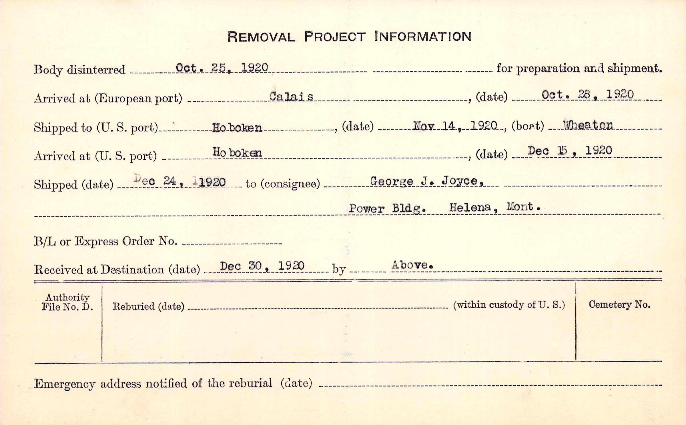 Body disinterred 10/25/1920 for preparation and shipment.