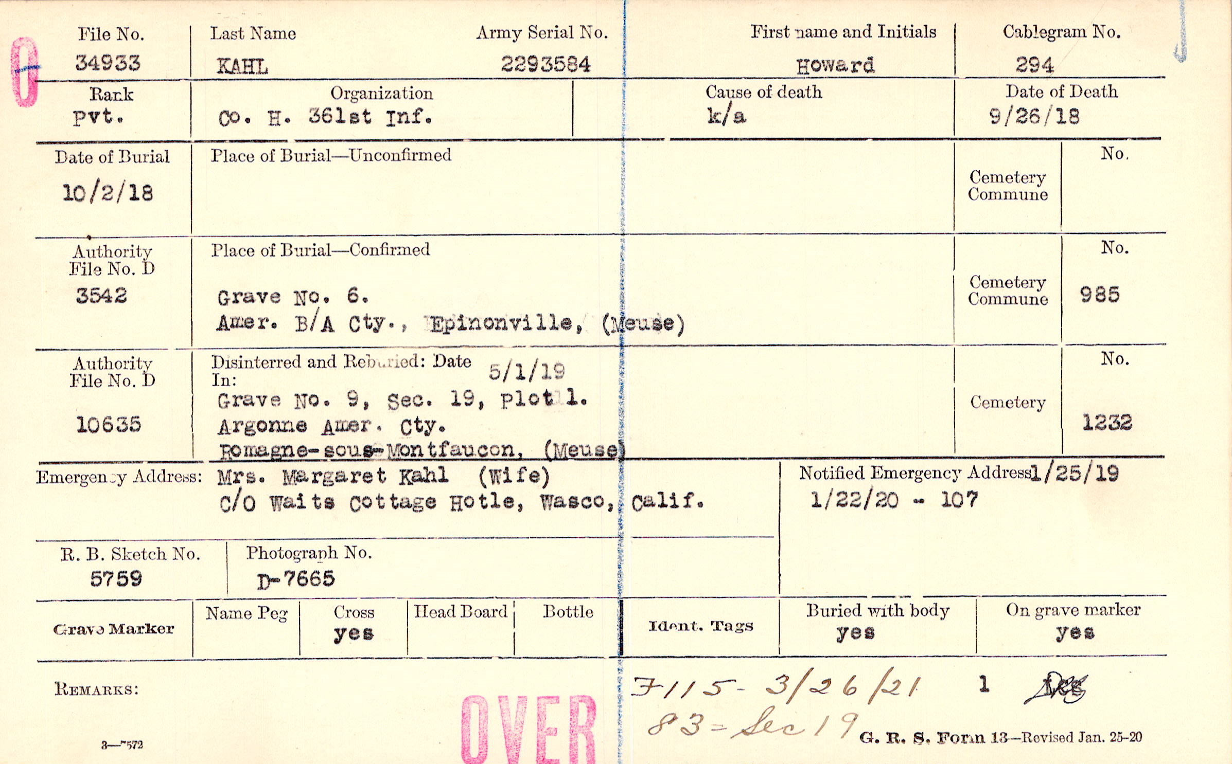 Mrs. Margaret Kahl (Wife), C/O Waits Cottage Hotle, Wasco, Calif.