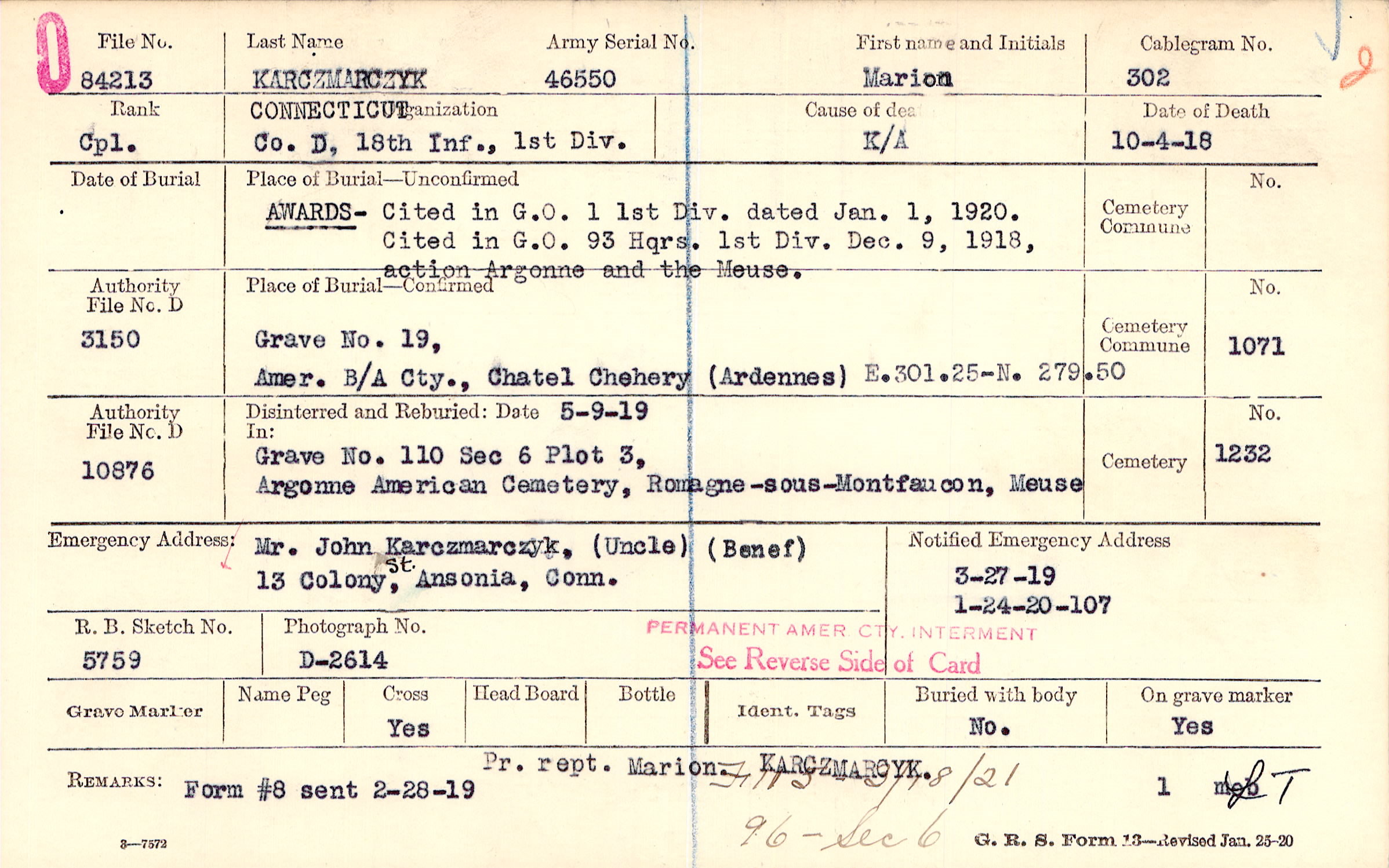 Mr. John Karczmarczyk, (Uncle), 13 Colony St, Ansonia, Conn., Mr. John Karczmarczyk, (Uncle) (Benef) 13 Colony St., Ansonia, Conn.
