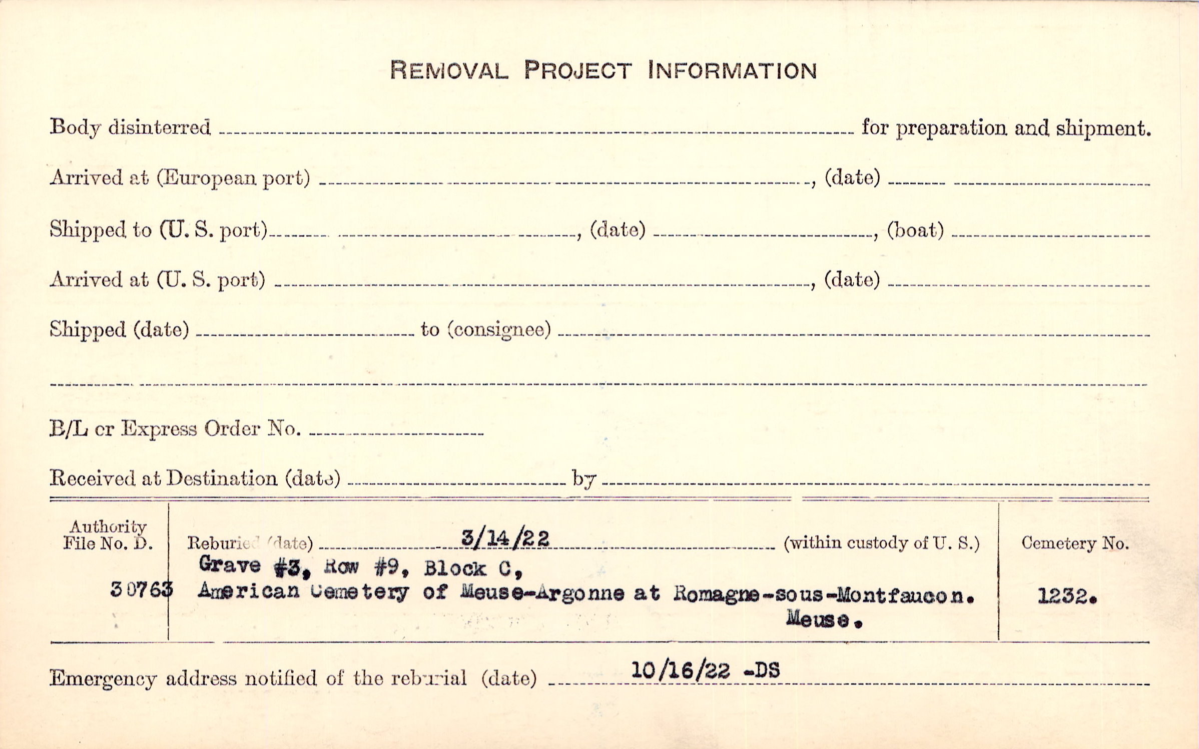 Grave 110, Section 6, Plot 3, Argonne American Cemetery, Romagne-sous-Montfaucon, Meuse