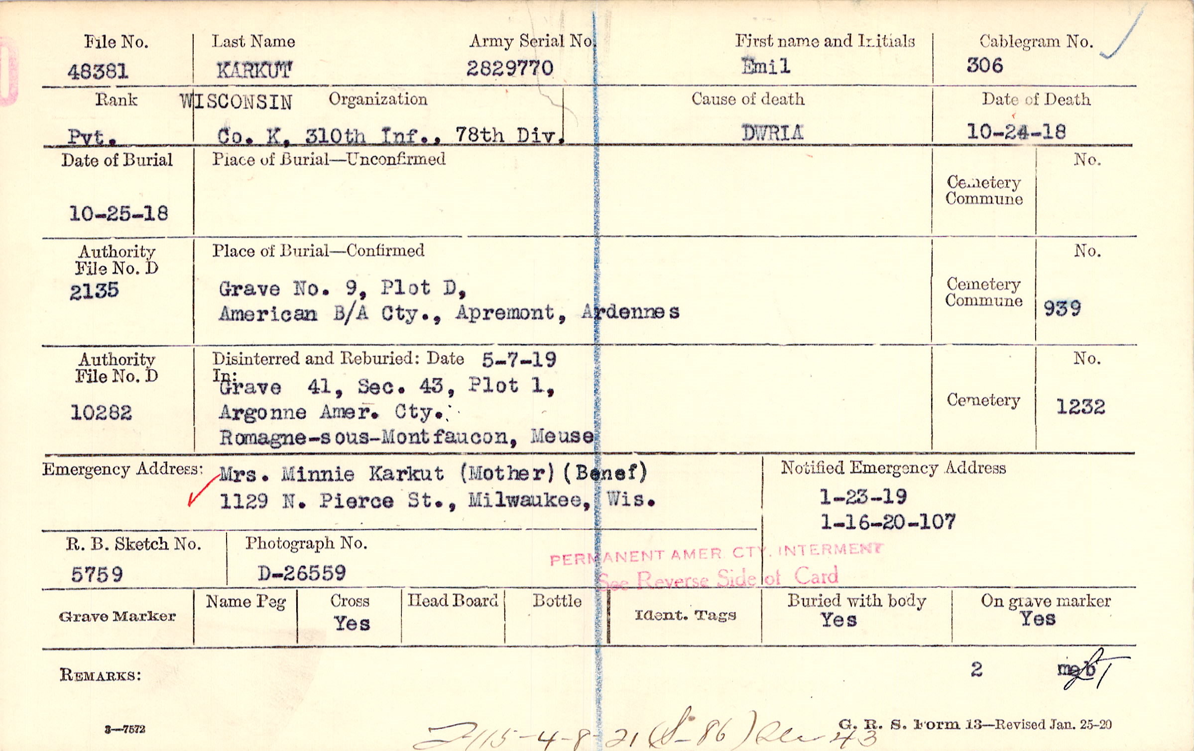 Mrs. Minnie Karkut (Mother), 1129 N. Pierce St., Milwaukee, Wis., (Benef)