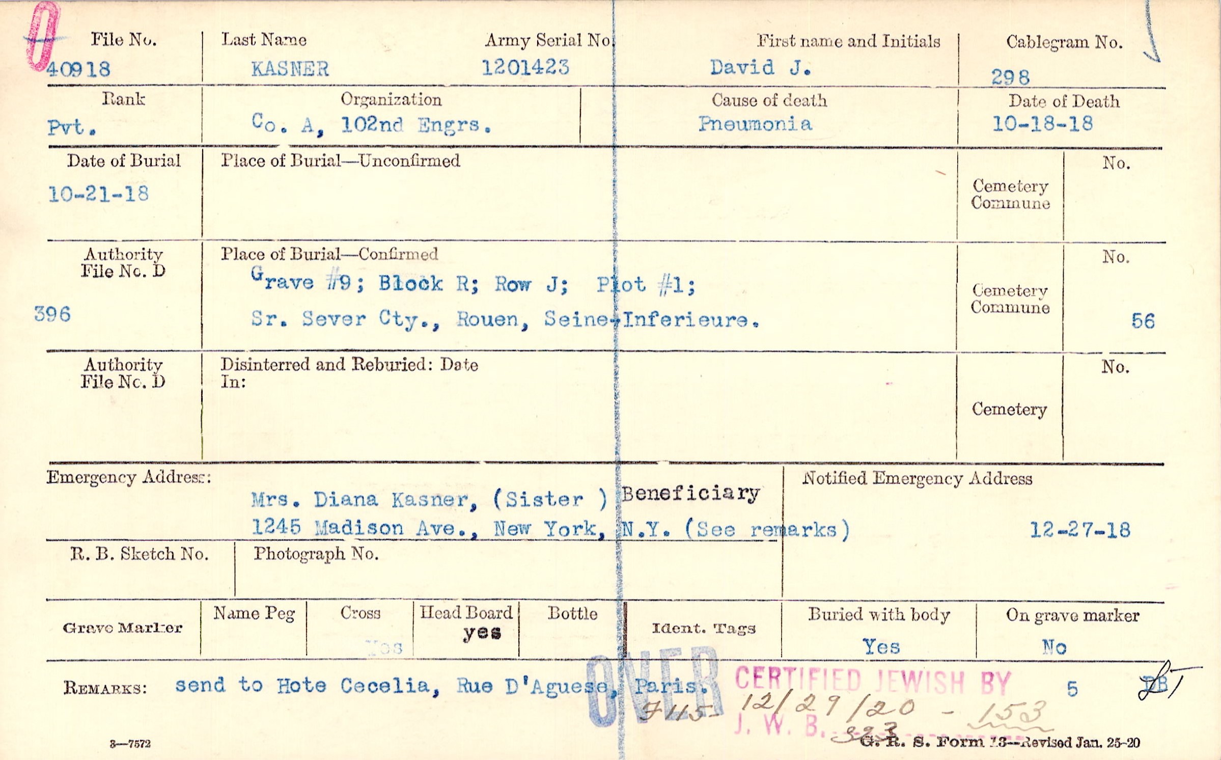 Grave #9, Block R, Row J, Plot #1, ,Sr. Sever Cty., Rouen, Seine-Inferieure.