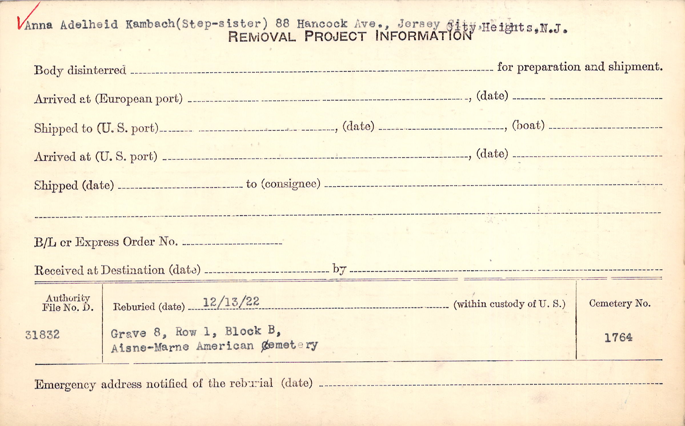 Anna Adelheid Kambach (Step-sister) 88 Hancock Ave., Jersey City Heights, N.J. |