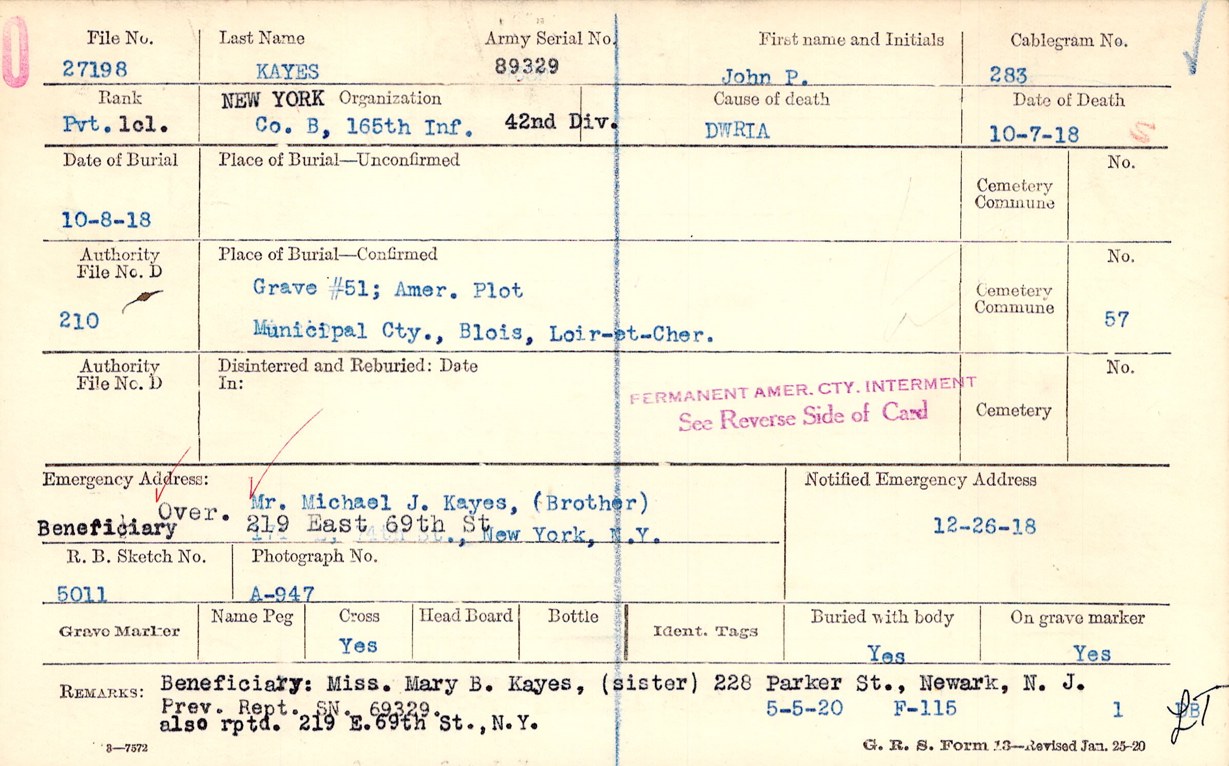 Beneficiary: Miss. Mary B. Kayes, (sister) 228 Parker St., Newark, N.J. Prev. Rept. SN 69329 also rptd. 219 E. 69th St., N.Y., 5-5-20 F-115