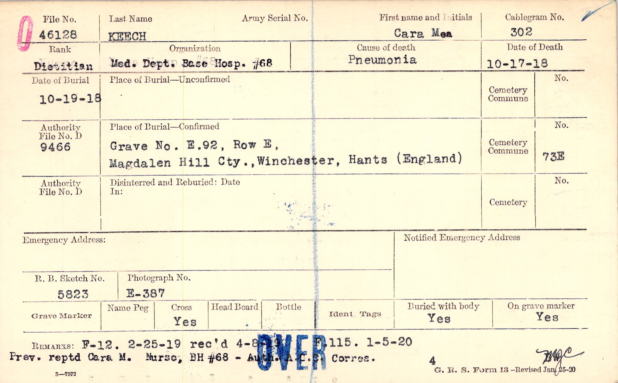 F-12. 2-25-19 rec'd 4-8-19 F.115. 1-5-20 Prev. reptd Cara M. Nurse, BH #68 - Auth A.C.C. Corres. 4 BW