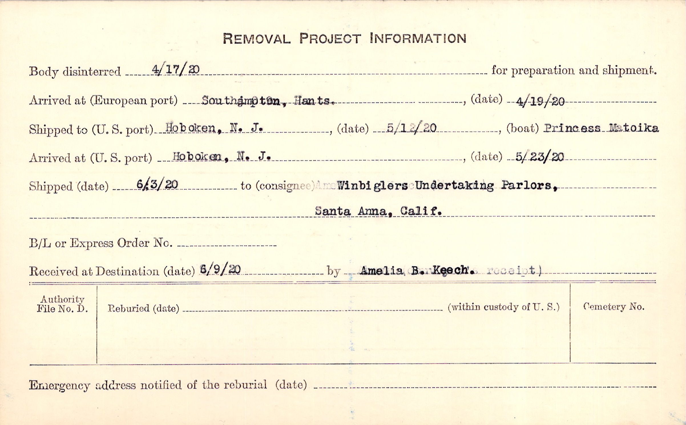 Body disinterred 4/17/1920 for preparation and shipment.