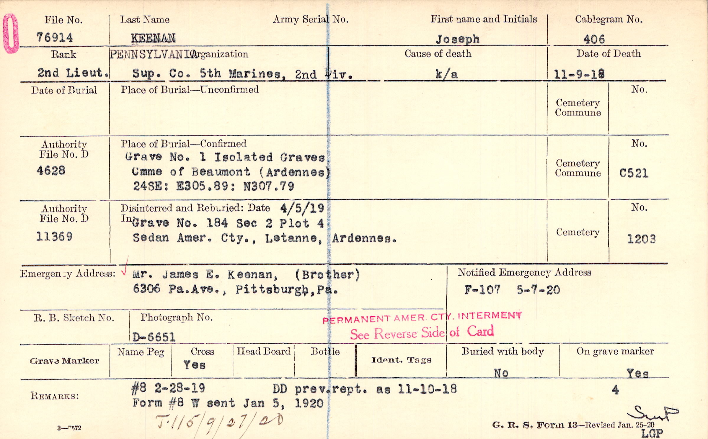 Mr. James E. Keenan, (Brother), 6306 Pa. Ave., Pittsburgh, Pa.