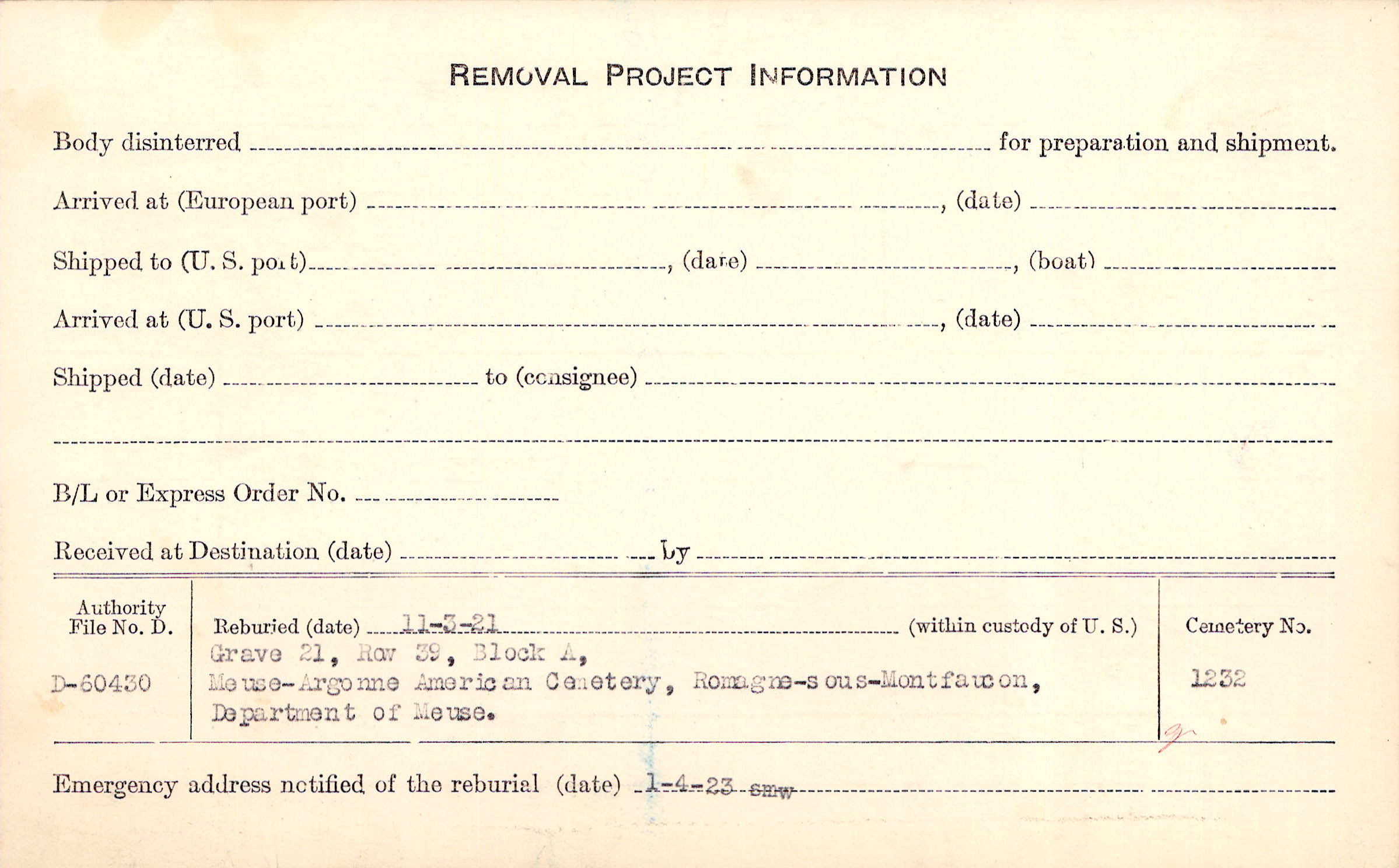 | Permanent Burial in Foreign Cemetery |