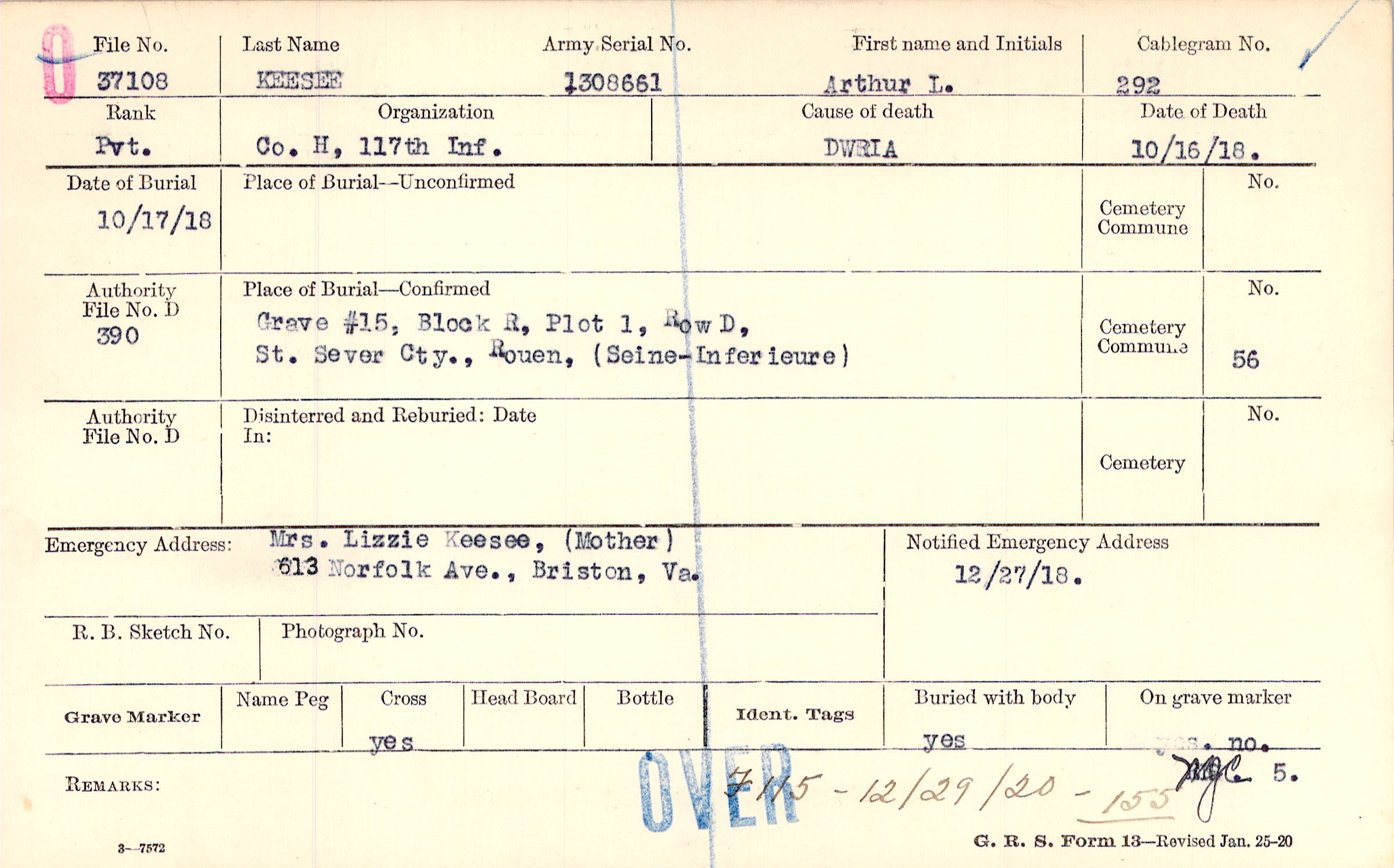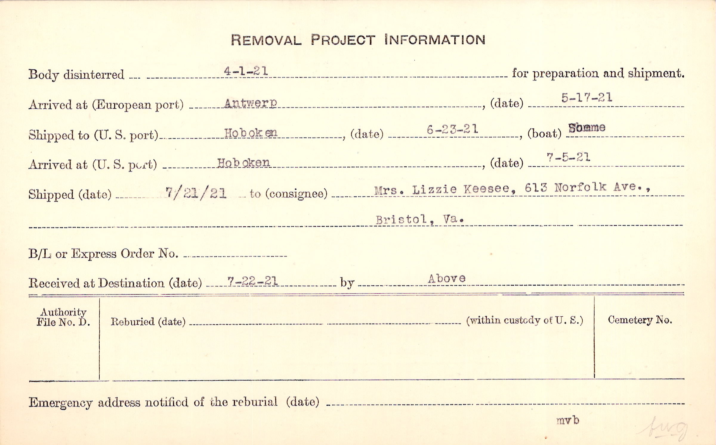 Mrs. Lizzie Keesee, (Mother), 613 Norfolk Ave., Briston, Va.
