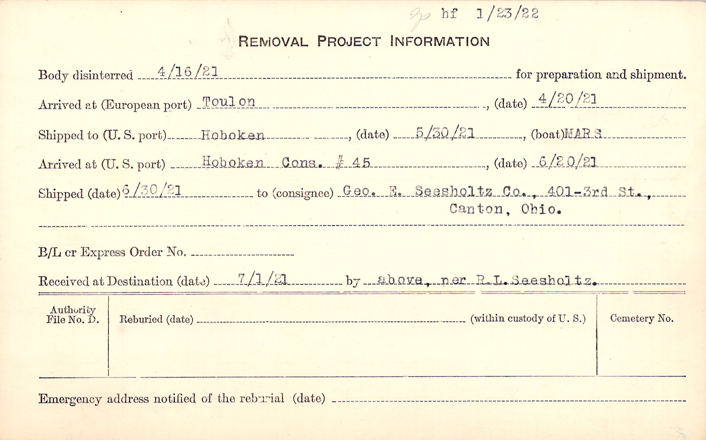 Body disinterred 4/16/1921 for preparation and shipment.
