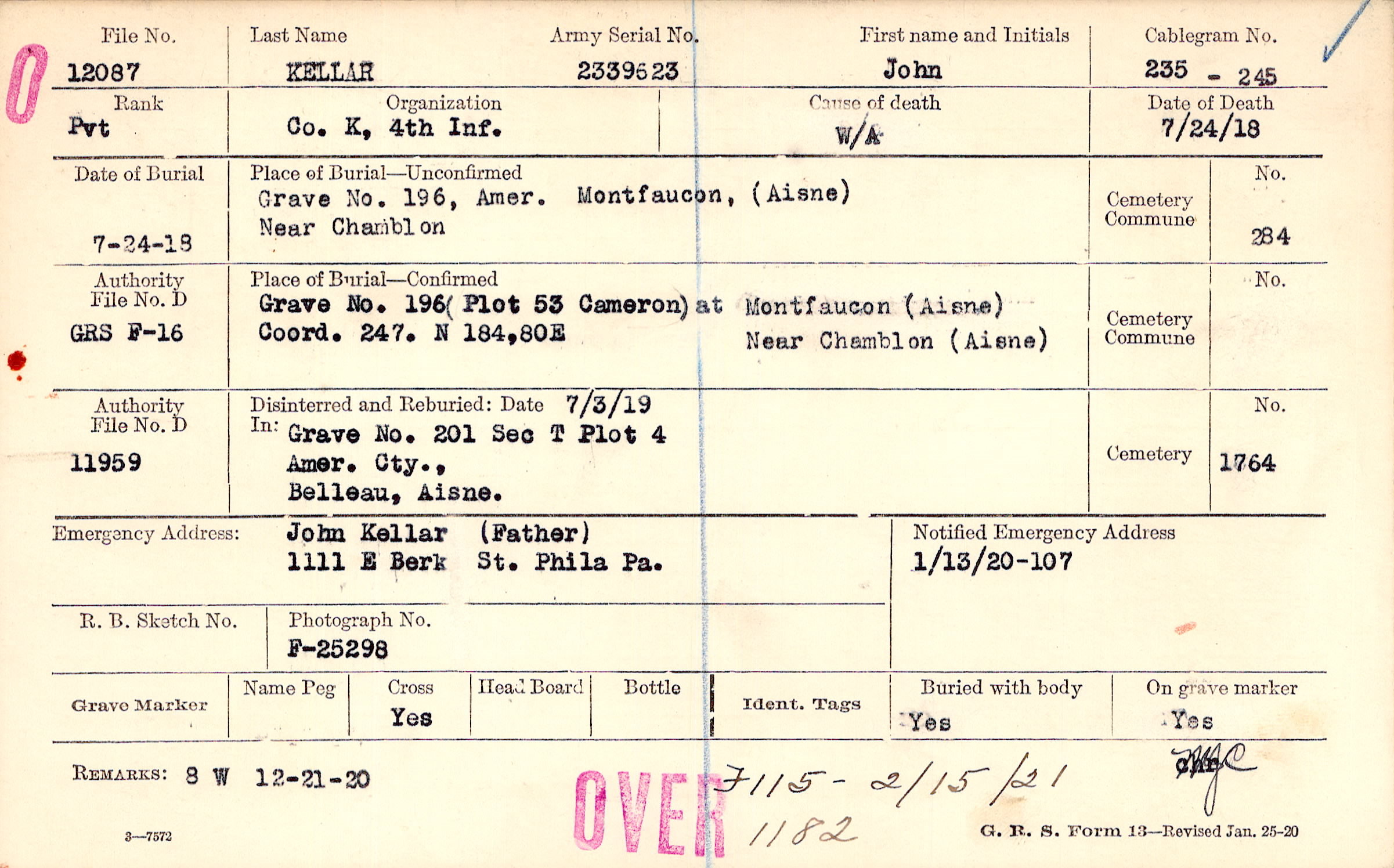 John Kellar (Father), 1111 E. Berk St. Phila Pa.