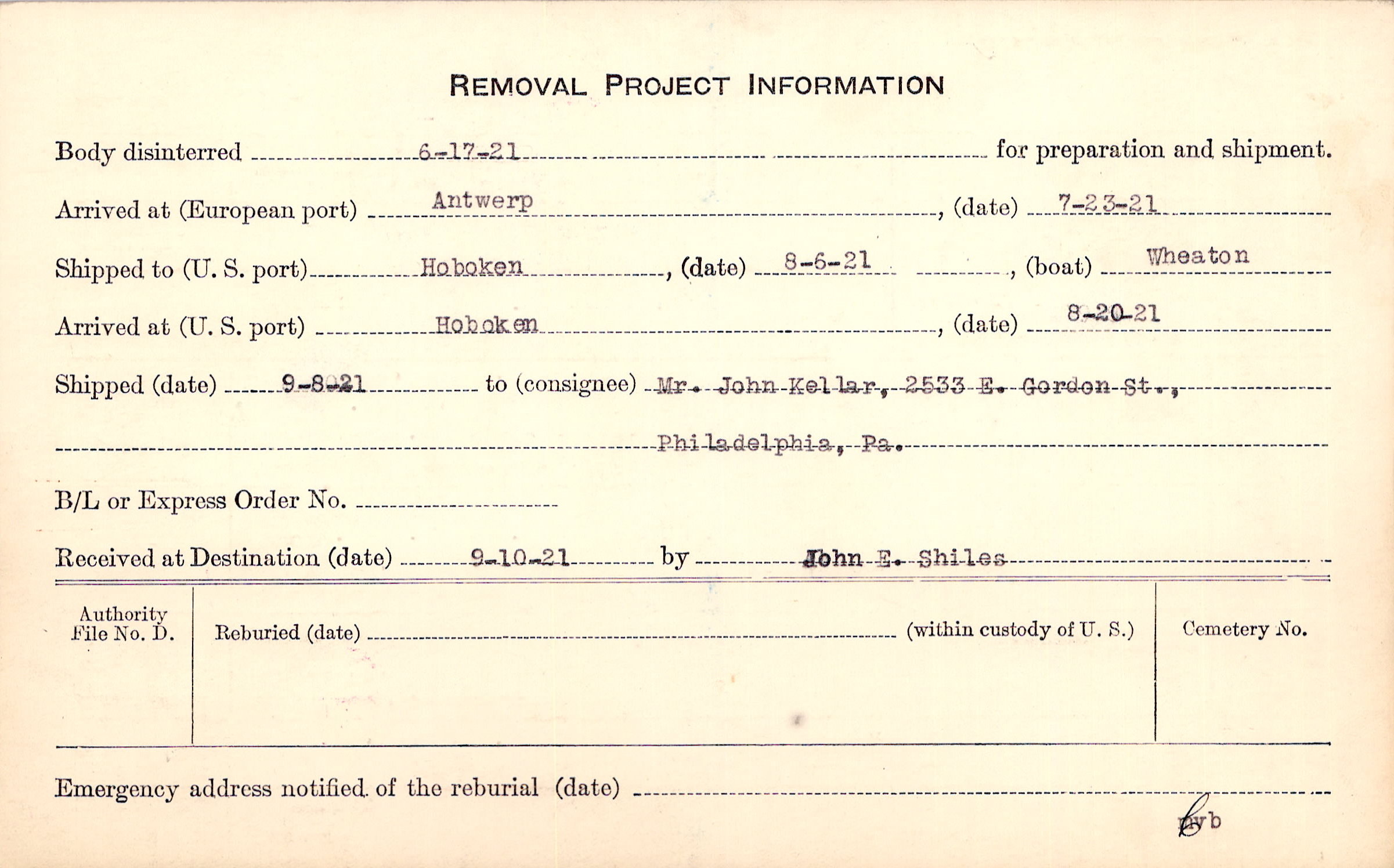 Body disinterred 6/17/1921 for preparation and shipment.