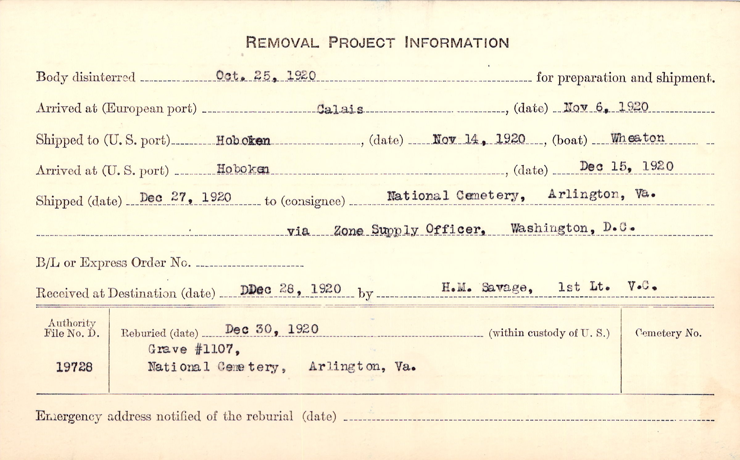 Body disinterred 10/25/1920 for preparation and shipment.