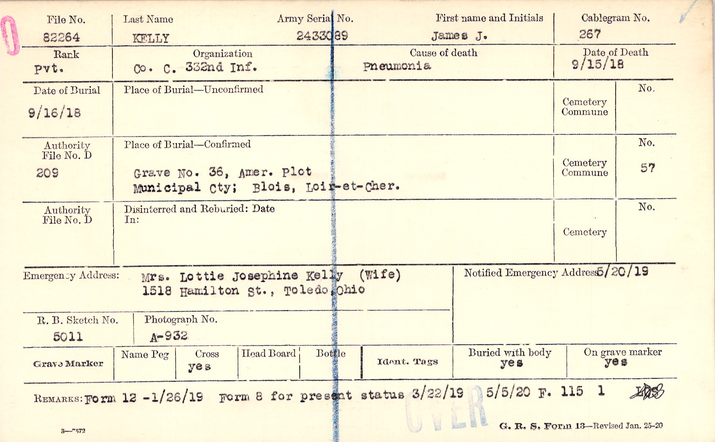 Mrs. Lottie Josephine Kelly (Wife), 1518 Hamilton St., Toledo, Ohio