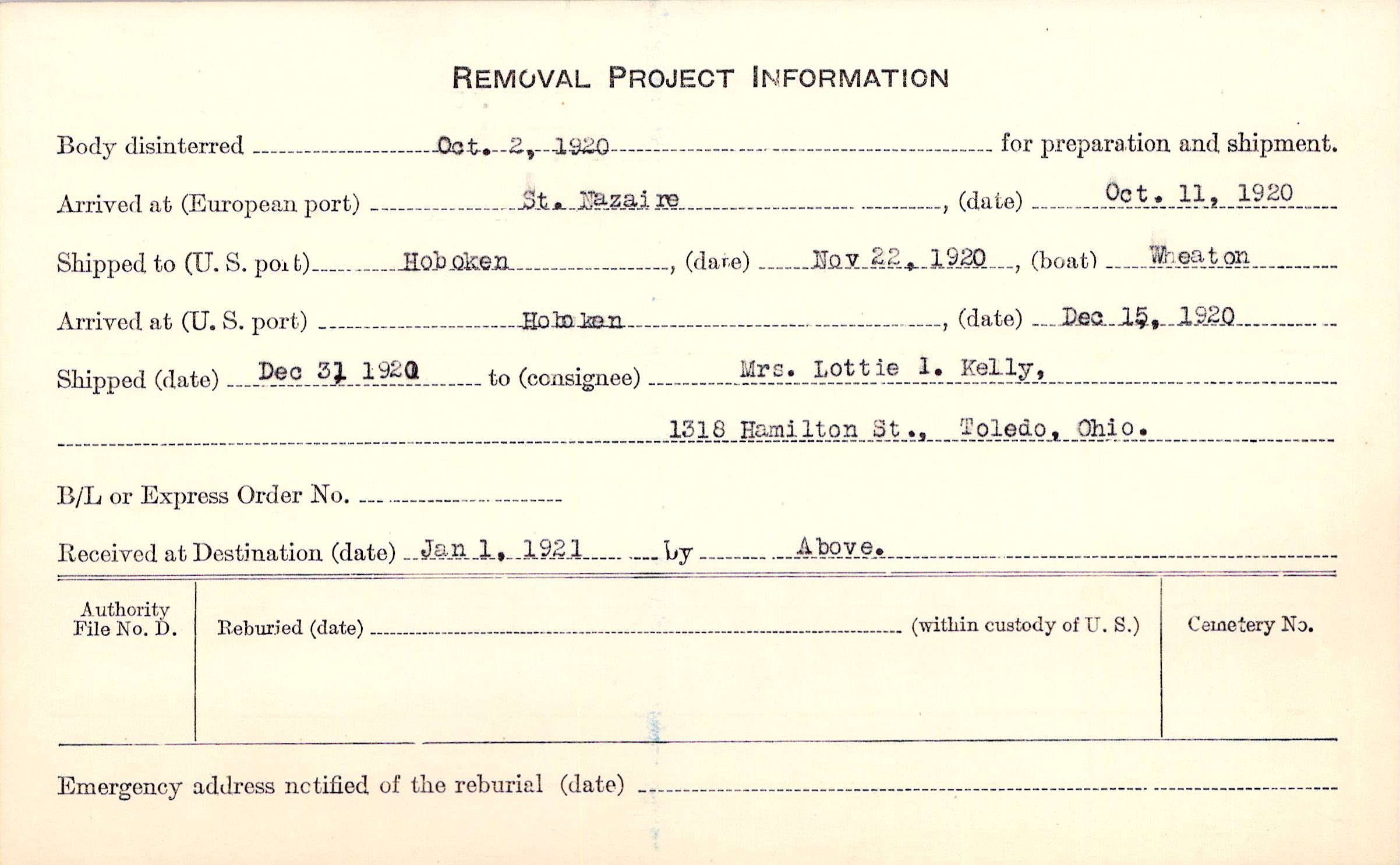 Body disinterred 10/2/1920 for preparation and shipment.
