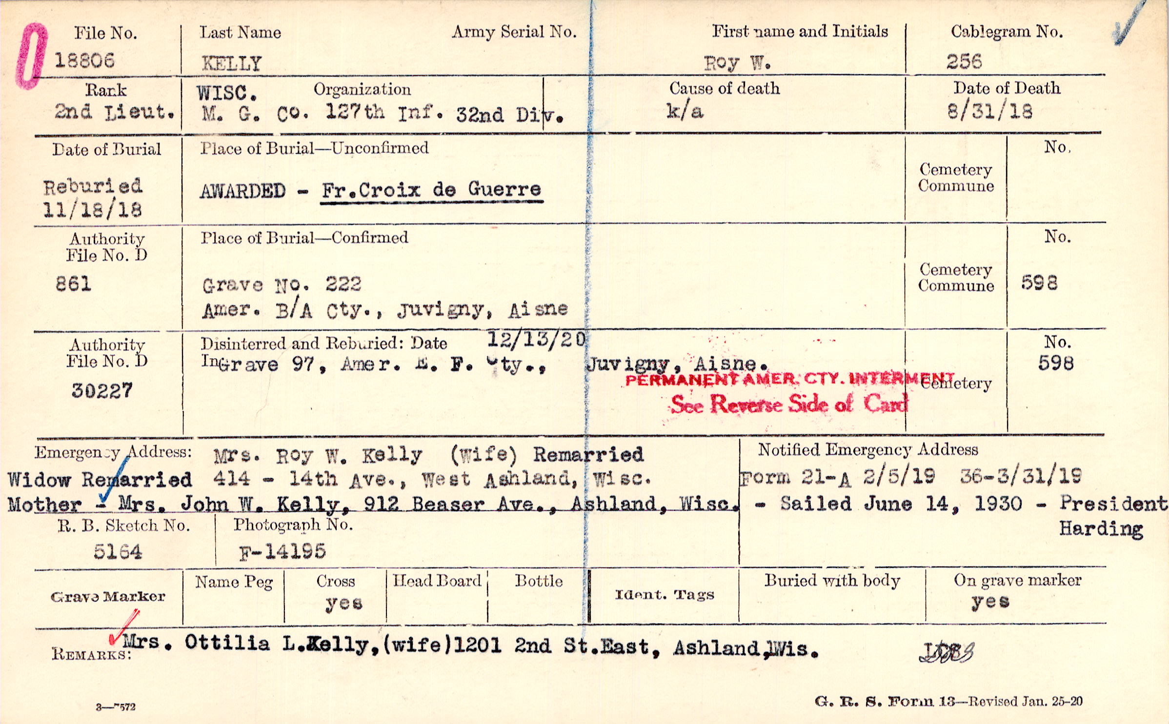Mrs. Ottilia L. Kelly, (wife) 1201 2nd St. East, Ashland, Wis.