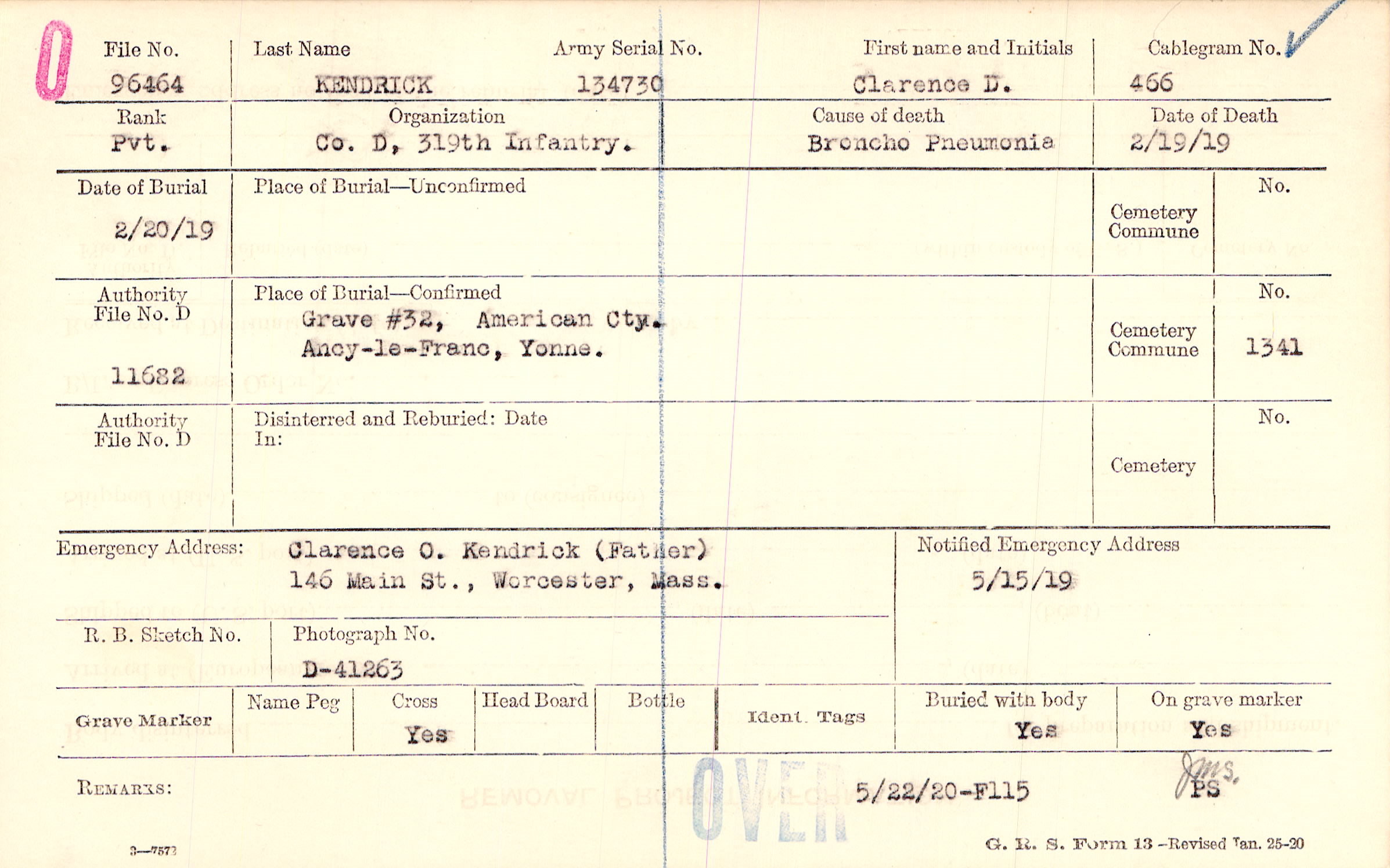 Clarence O. Kendrick (Father), 146 Main St., Worcester, Mass.