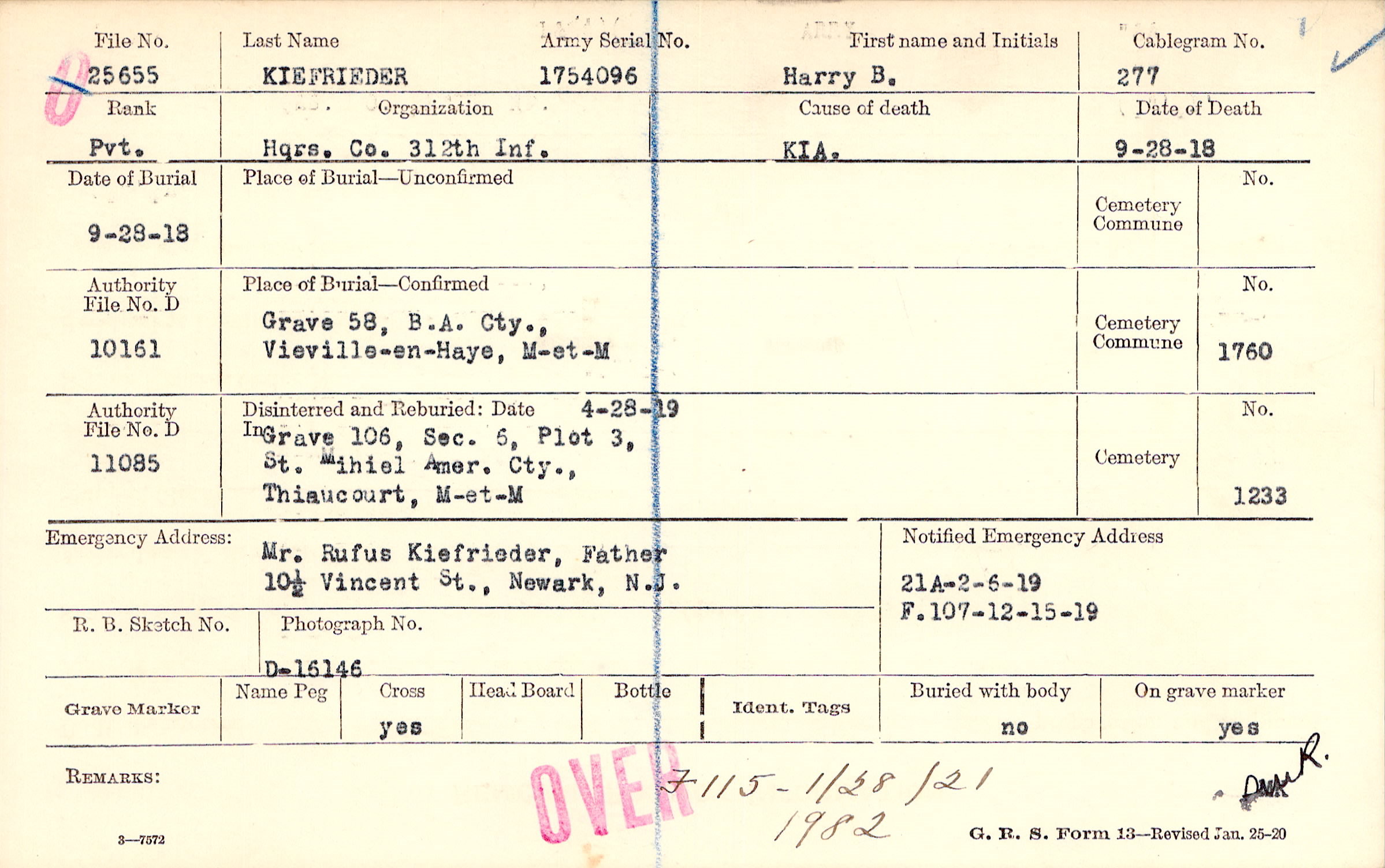Mr. Rufus Kiefrieder, Father, 10 1/2 Vincent St., Newark, N.J.