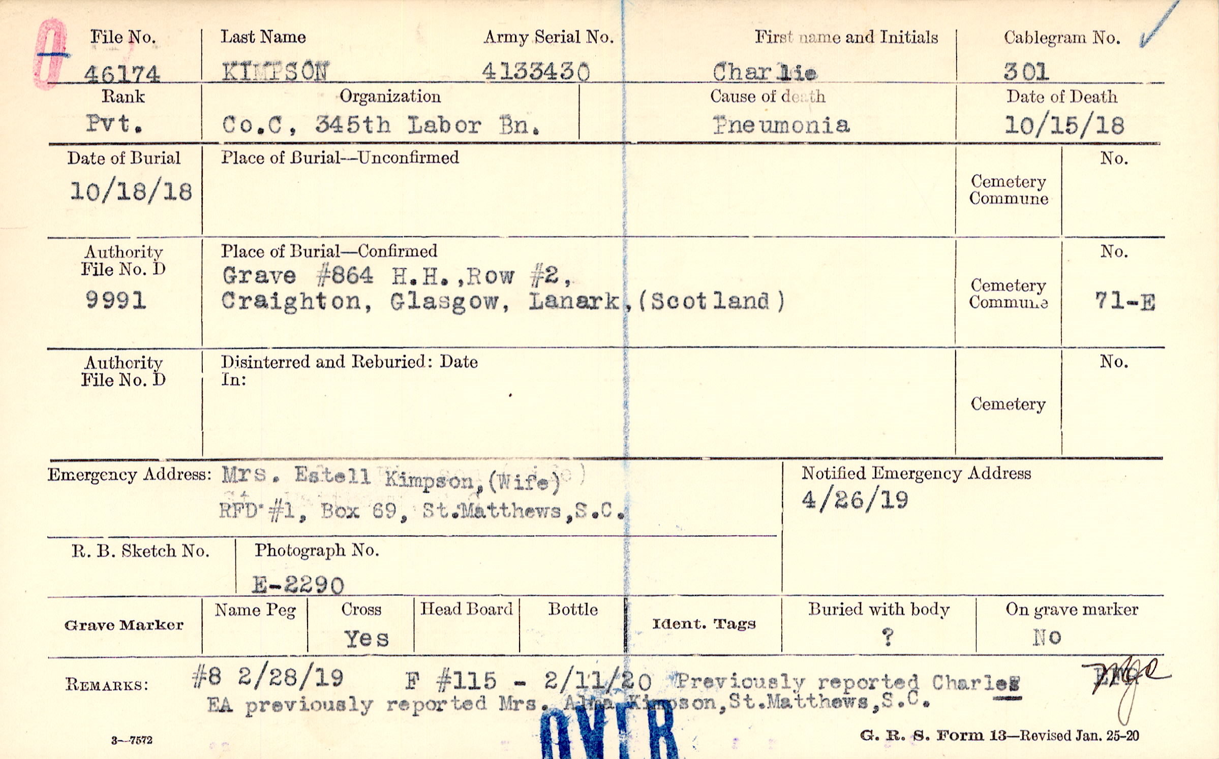 Mrs. Estell Kimpson, (Wife), RFD #1, Box 69, St. Matthews, S. C.
