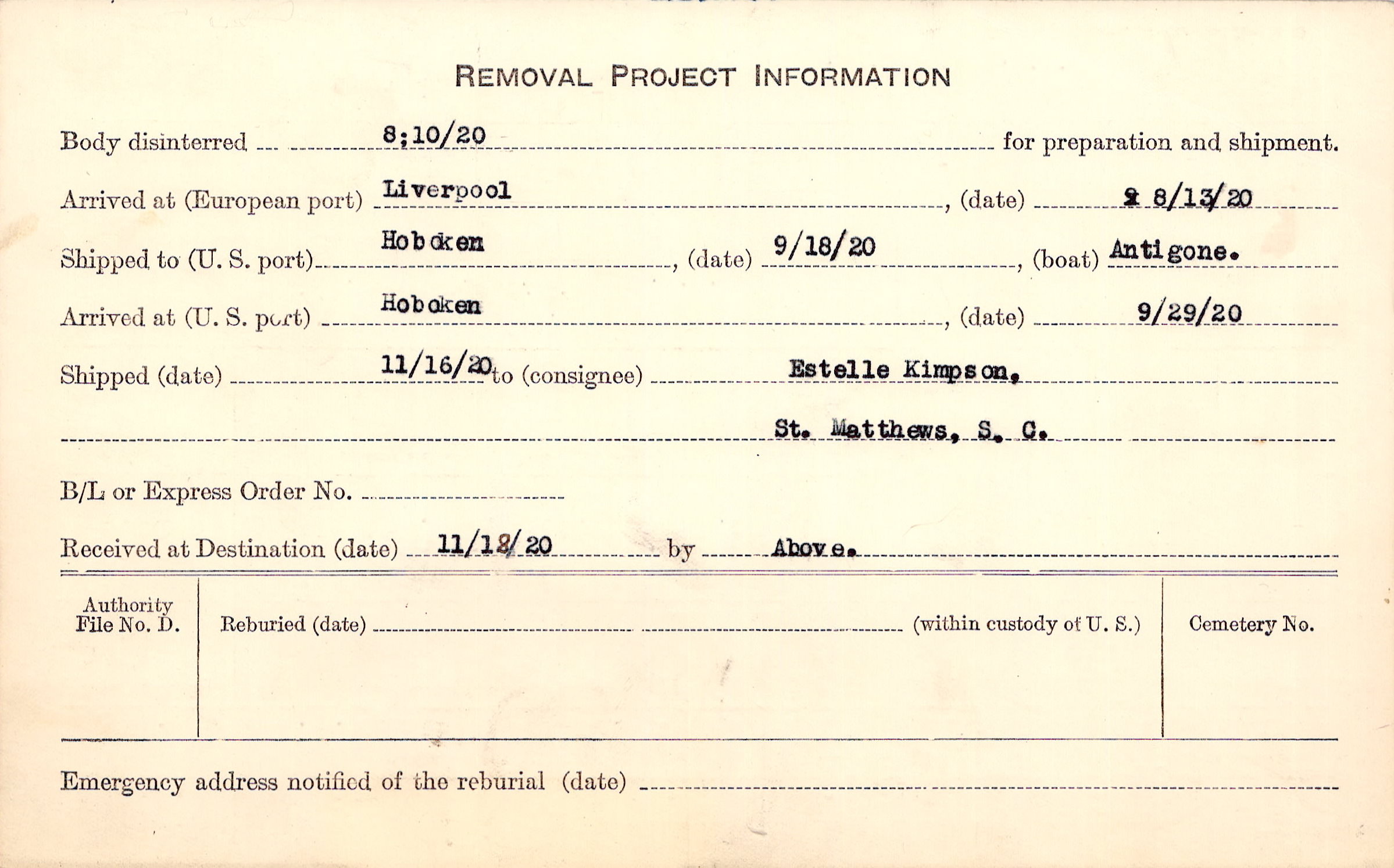 Body disinterred 8/10/1920 for preparation and shipment.