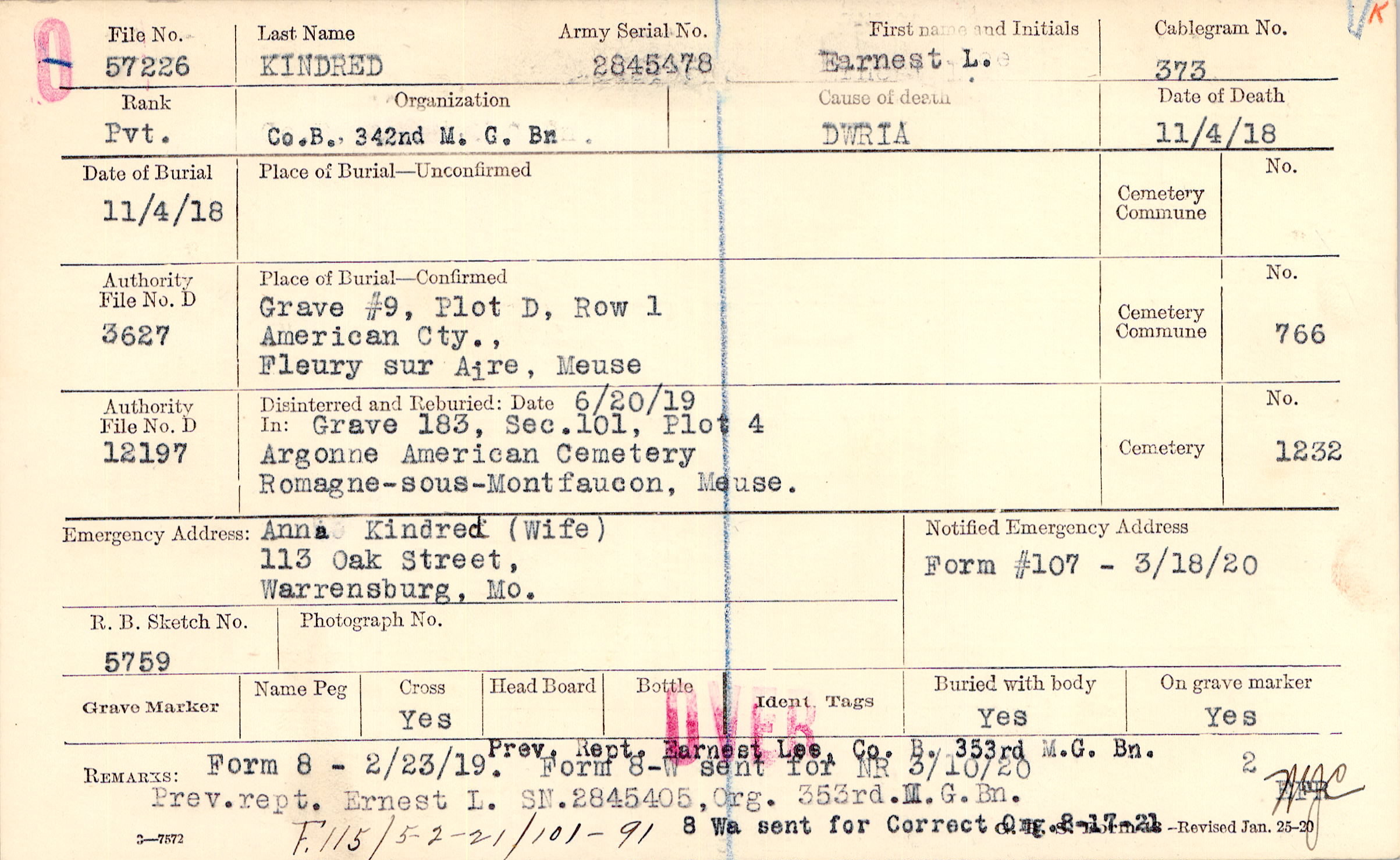 Prev. Rept. Earnest Lee, Co. B 353rd M.G. Bn. Prev. rept. Ernest L. SN.2845405, Org. 353rd. M.G. Bn., Form 8 - 2/23/19. Form 8-W sent for NR 3/10/20 Prev. rept. Ernest L. SN 2845405, Org. 353rd. M.G.Bn. 8 Wa sent for Correct Org. 8-17-21, F115/ 5-2-21 / 101-91